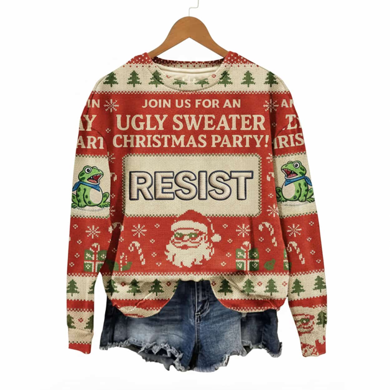 Designed in classic “ugly sweater” fashion, this sweatshirt features a chaotic collage of holiday cheer: snowflakes, Christmas trees, wrapped gifts, and a jolly Santa. But the real stars? Two cartoon frogs flanking the chest like sentinels of satire. Between them, bold text reads: “JOIN US FOR AN UGLY SWEATER CHRISTMAS PARTY! RESIST.” It’s part invitation, part insurrection, and all attitude.