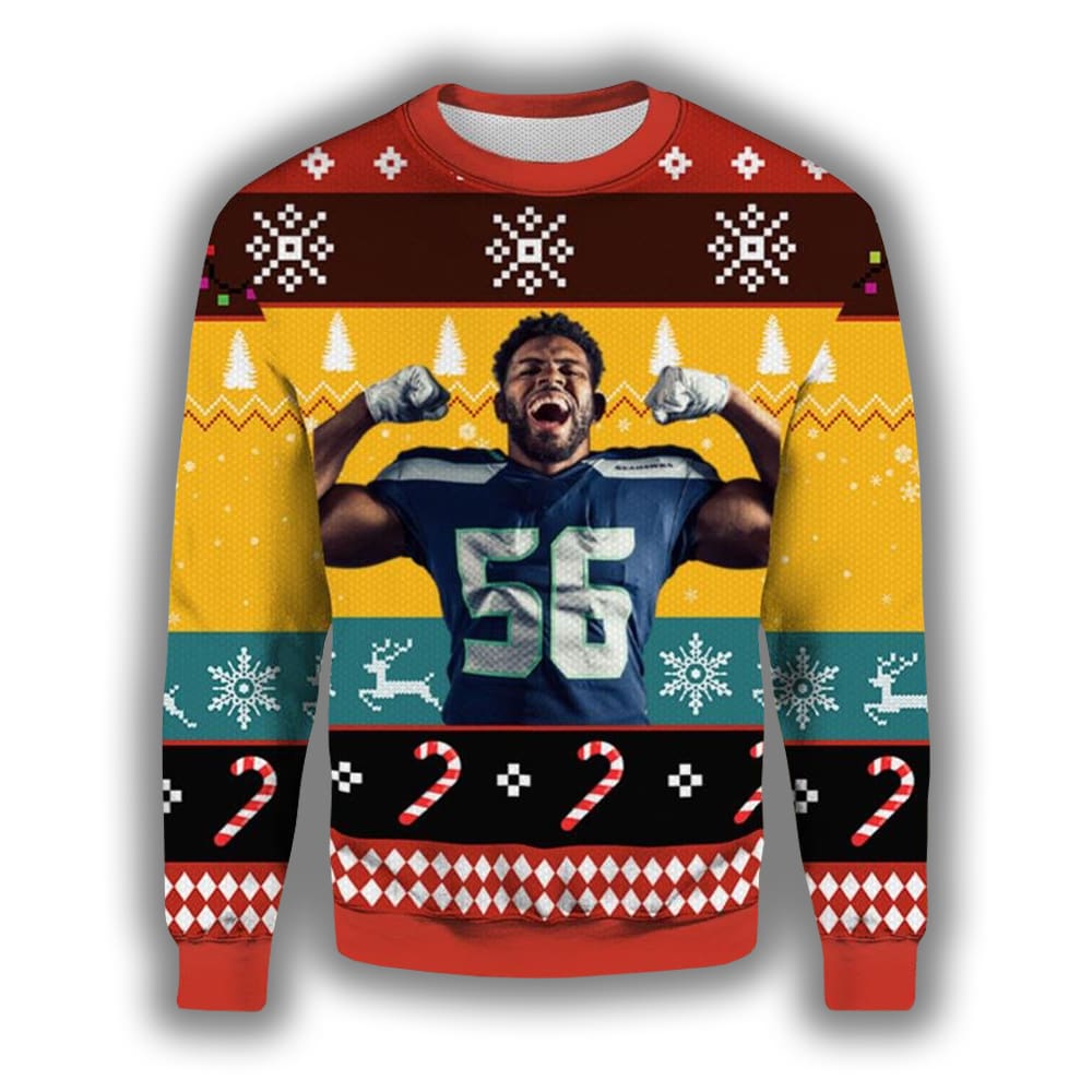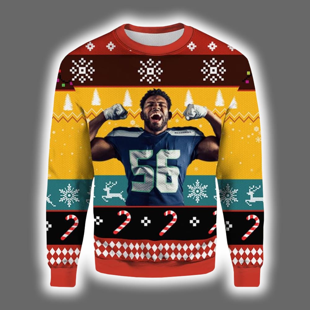 This isn’t your grandma’s holiday knit. The Jordyn Brooks Seahawks Ugly Christmas Sweater is a vibrant explosion of team spirit and seasonal joy. Front and center, linebacker Jordyn Brooks—decked out in his navy #56 jersey—is captured mid-flex, roaring with energy like he just sacked Santa himself. Surrounding him are classic holiday icons: snowflakes, candy canes, reindeer, and Christmas trees, all woven into bold horizontal bands of red, green, yellow, and black.