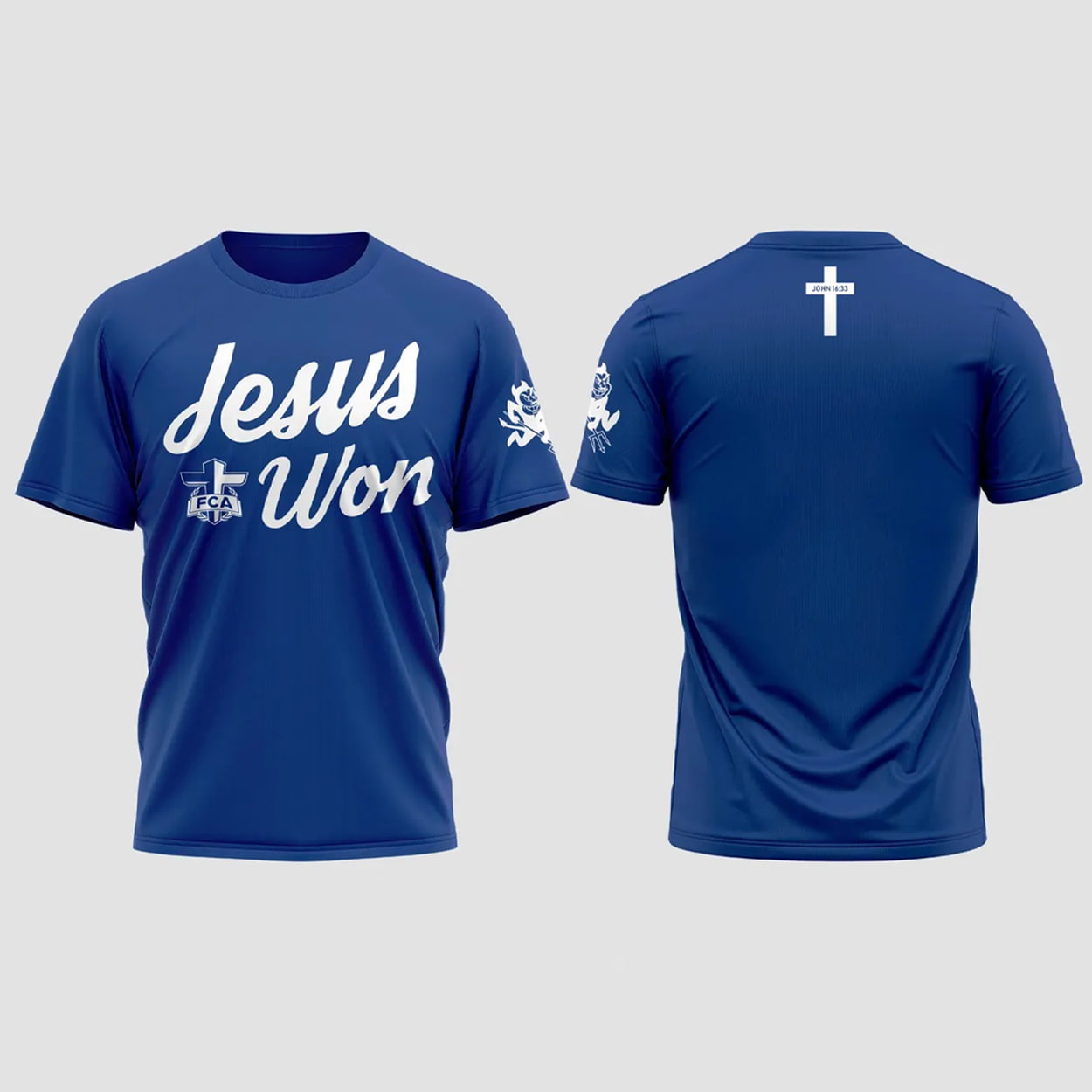 Step into the spotlight with this shirt—a design that’s as fearless as your faith. This vibrant blue tee features “Jesus Won” splashed across the chest in bold white cursive, making it clear where victory lies. Just beneath the word “Jesus,” a sleek cross graphic intertwines with the word “TCA,” adding a subtle yet striking touch. The left sleeve carries a stylized cross emblem, while the back keeps it clean with a single white cross centered near the top. Whether you’re in the stands or on the streets, this shirt speaks volumes without saying a word.