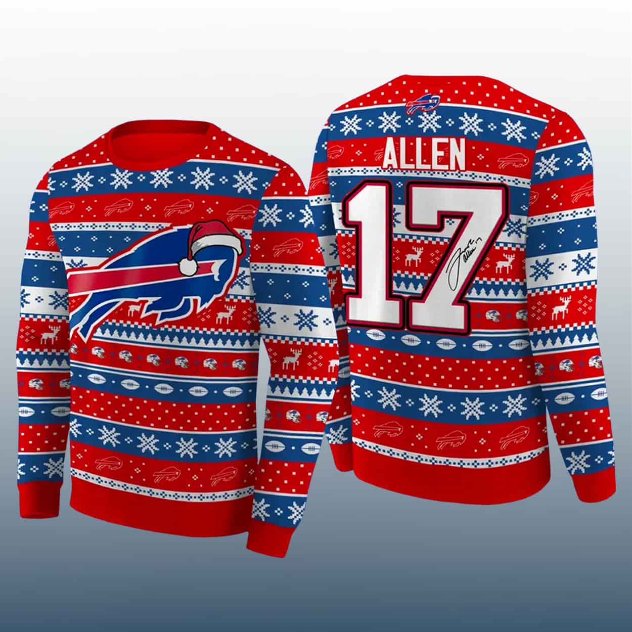 Get ready to tackle the holiday season with this sweater—a fan-favorite fusion of football fever and festive fun. This eye-catching sweater bursts with Bills spirit, featuring a bold red, blue, and white palette adorned with snowflakes, reindeer, footballs, and the unmistakable Bills logo. Front and center, the team’s iconic charging buffalo dons a Santa hat, bringing a jolly twist to gridiron grit. Flip it around and you’ll find “ALLEN” and the number “17” emblazoned proudly across the back, complete with a printed signature that makes this piece feel like a personal shoutout from the quarterback himself.