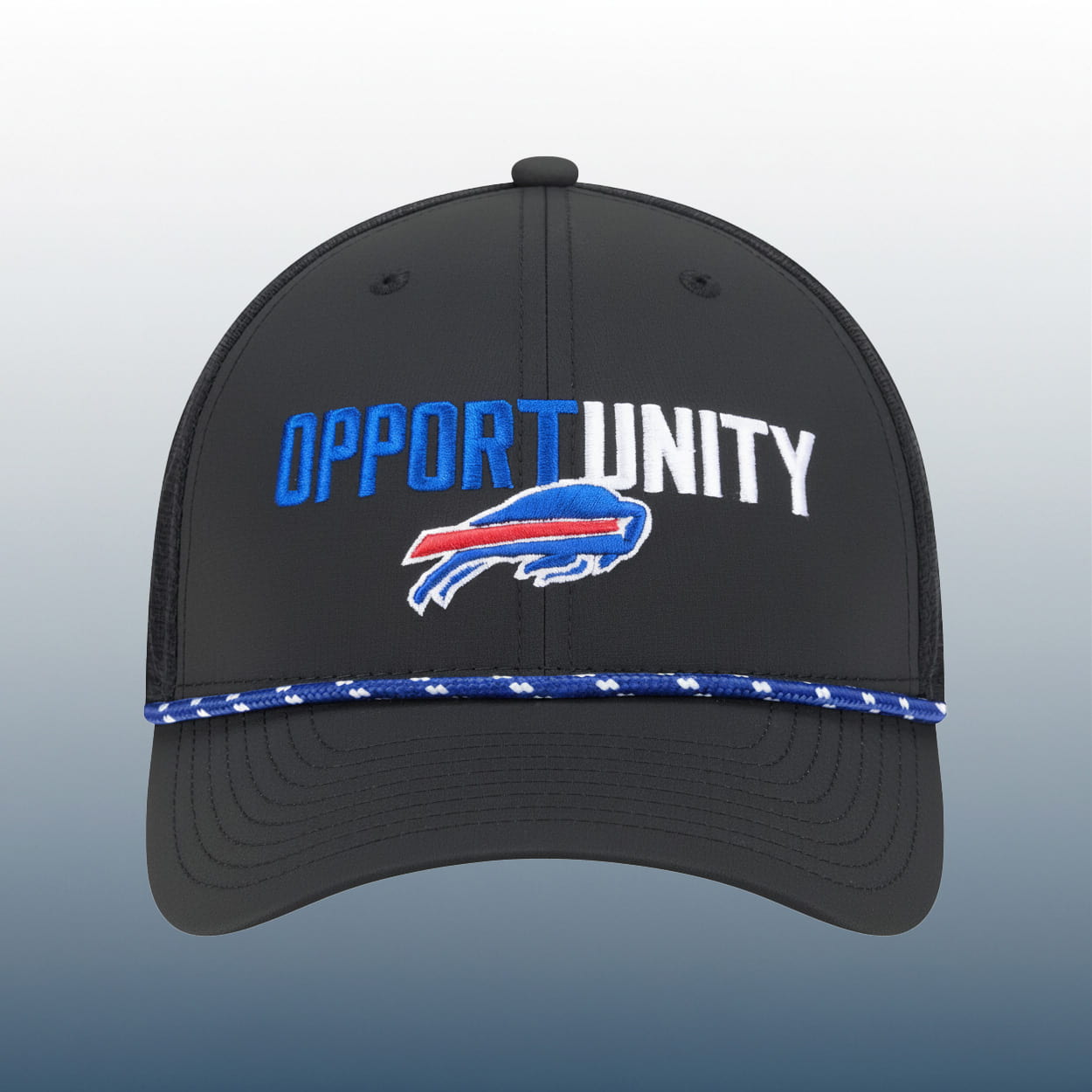 Step into the spotlight with this hat—a head-turning accessory that’s more than just game-day gear. This cap features the word “OPPORTUNITY” embroidered across the front in a dynamic split-tone design: “OPPORT” in electric blue and “UNITY” in crisp white. It’s a clever visual play that highlights the power of coming together while chasing greatness. Below the message, the iconic Buffalo Bills logo—a charging blue buffalo streaked with red—adds a fierce touch of team spirit. A braided blue-and-white rope across the brim adds a retro twist that pops with personality.
