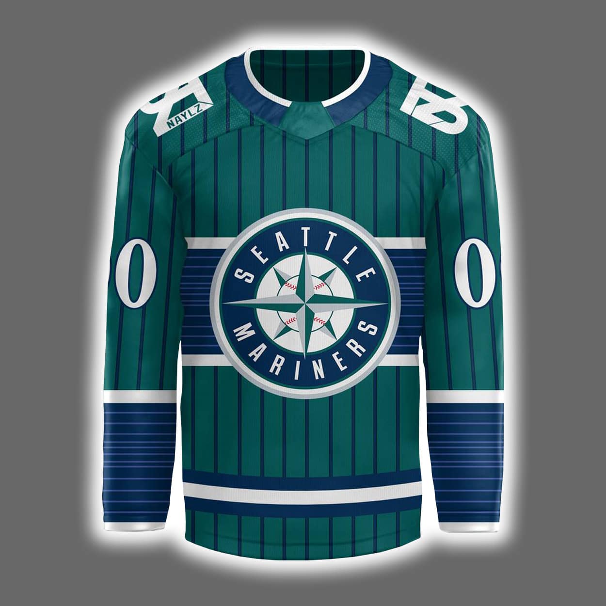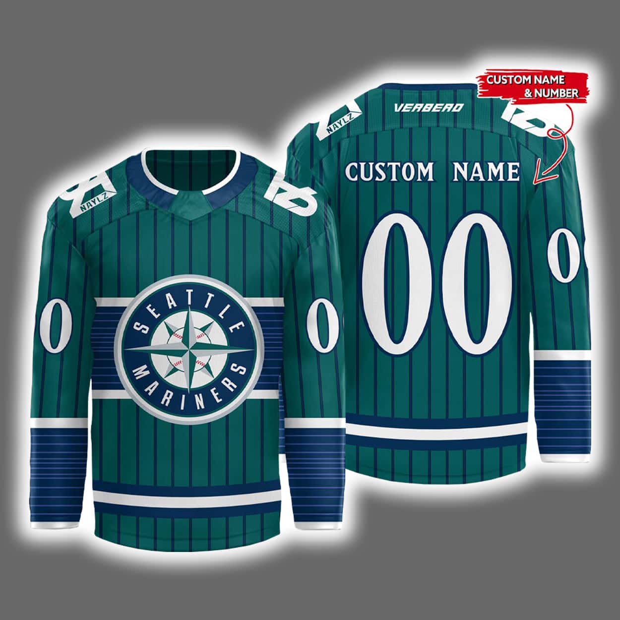 This isn’t your average fan gear—it’s a full-on flex. This jersey fuses baseball bravado with hockey grit in a design that’s as fearless as its namesake. The front rocks a circular compass rose logo surrounded by “SEATTLE MARINERS,” set against deep green pinstripes that scream vintage cool. Navy and white accents add sharp contrast, while the back lets you personalize the name and number—because legends deserve their own stamp.