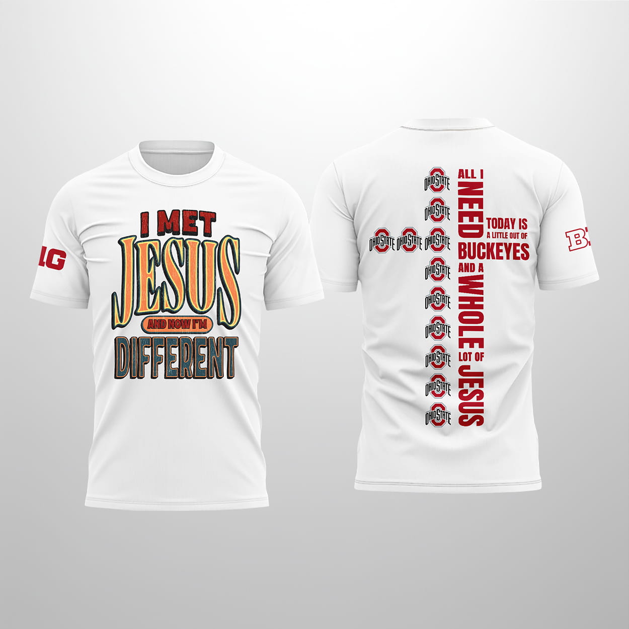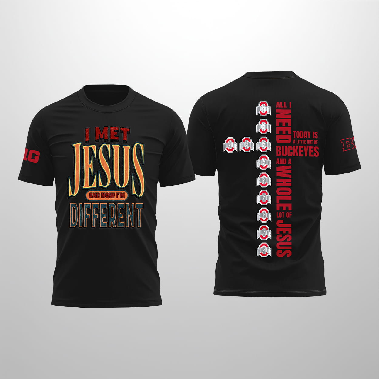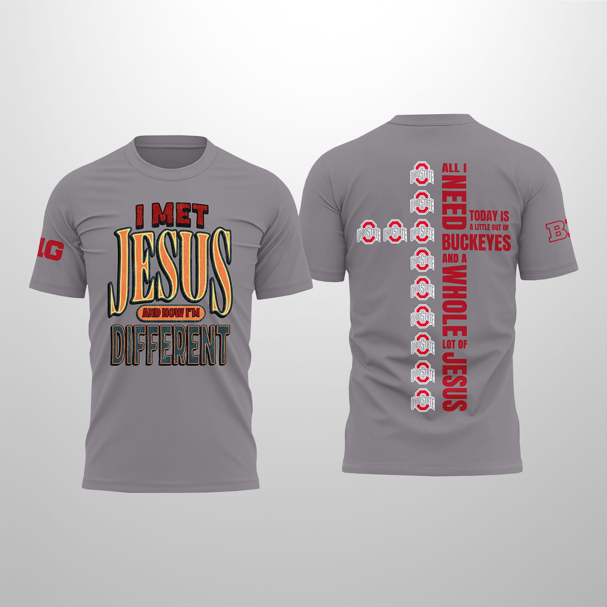 Turn heads and spark conversations with this shirt. The front bursts with powerful typography: “JESUS” shines in gold with a black outline, while “AND NOW I’M DIFFERENT” pops in red and black, making your testimony loud and proud. Flip to the back and you’ll find a striking cross built from Ohio State logos, paired with the message: “ALL I NEED TODAY IS A LITTLE BIT OF BUCKEYES AND A WHOLE LOT OF JESUS.” It’s a visual touchdown for believers and Buckeye fans alike.