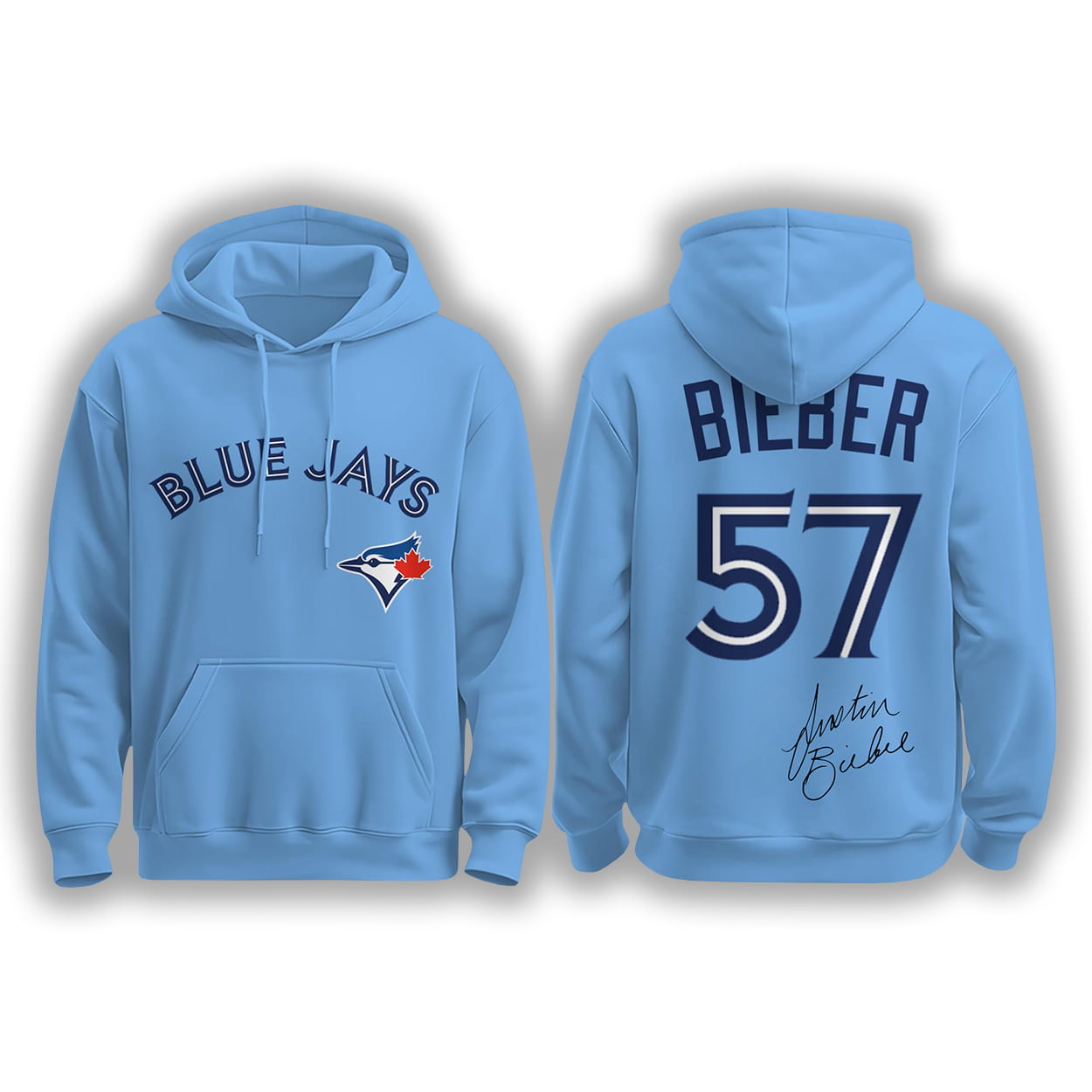 Turn heads and spark conversations with this electrifying set. The hoodie features “BLUE JAYS” in bold navy lettering across the chest, paired with the team’s iconic bird logo—because why choose between music and sports when you can rep both? Flip it around and you’ll find “BIEBER” stamped proudly across the back, with the number “57” in crisp white digits outlined in navy. A sleek cursive “Justin Bieber” signature seals the look, making this piece feel like it came straight from his tour wardrobe. Coordinated joggers and a matching cap complete the ensemble, giving you a head-to-toe vibe that screams all-access pass.