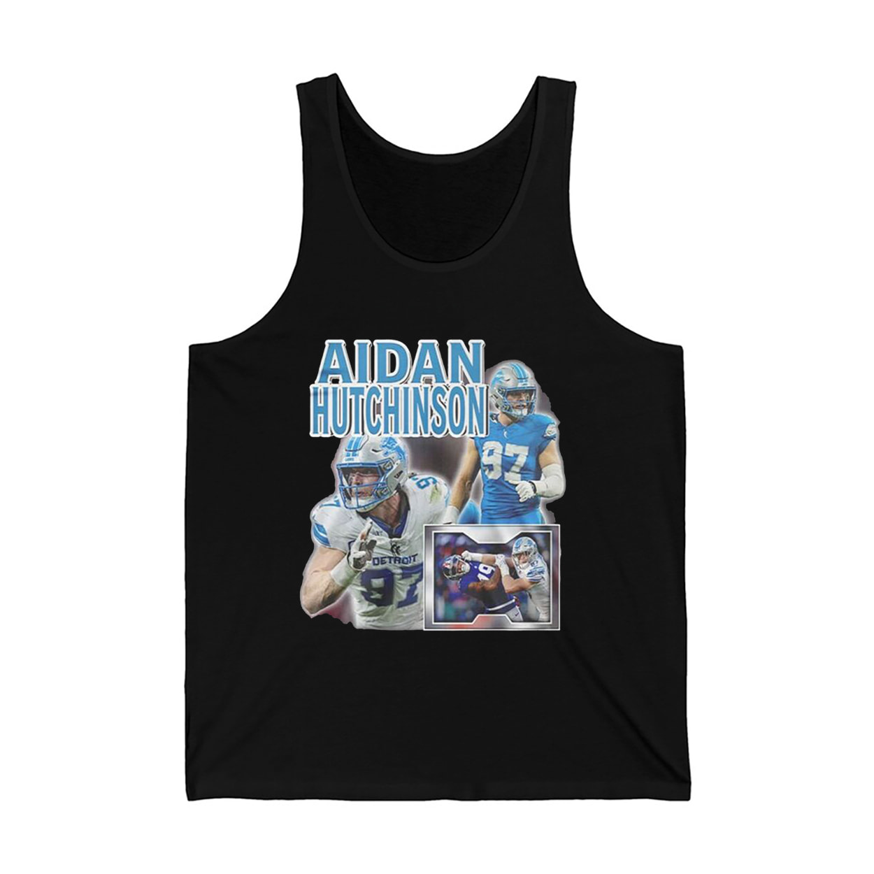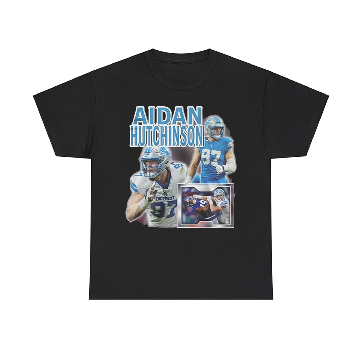 This shirt isn’t just apparel—it’s a full-on celebration of Aidan Hutchinson’s dominance on the field. Front and center, you’ll find a dynamic collage of Hutchinson in action: charging the line, locked in focus, and ready to wreak havoc. His iconic number 97 pops in crisp white and blue, while the name “AIDAN HUTCHINSON” blazes across the top in bold, electric lettering. It’s a visual touchdown for any fan of Detroit football or defensive brilliance.