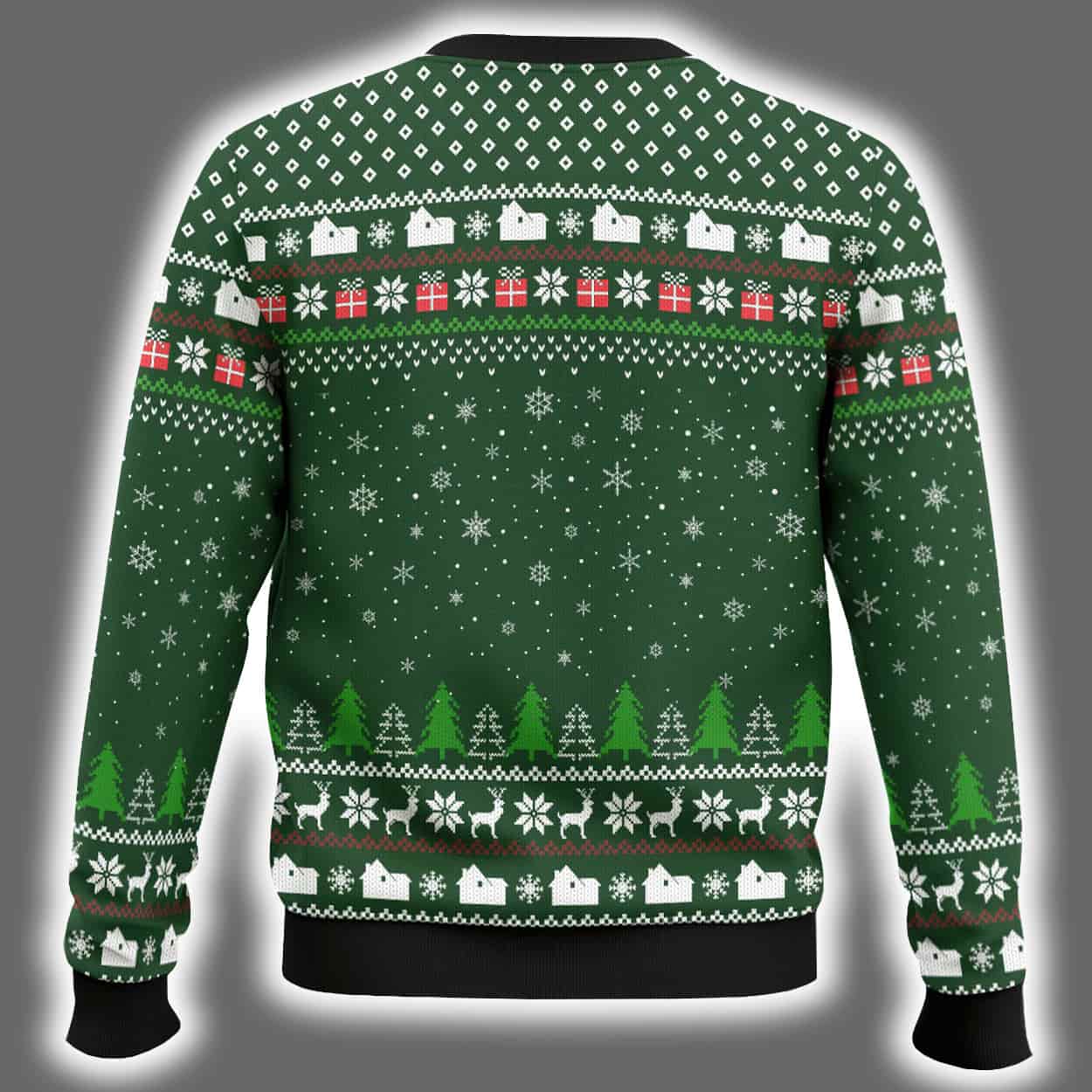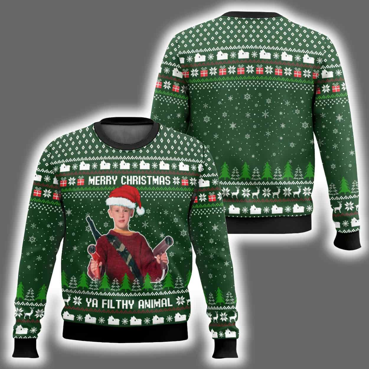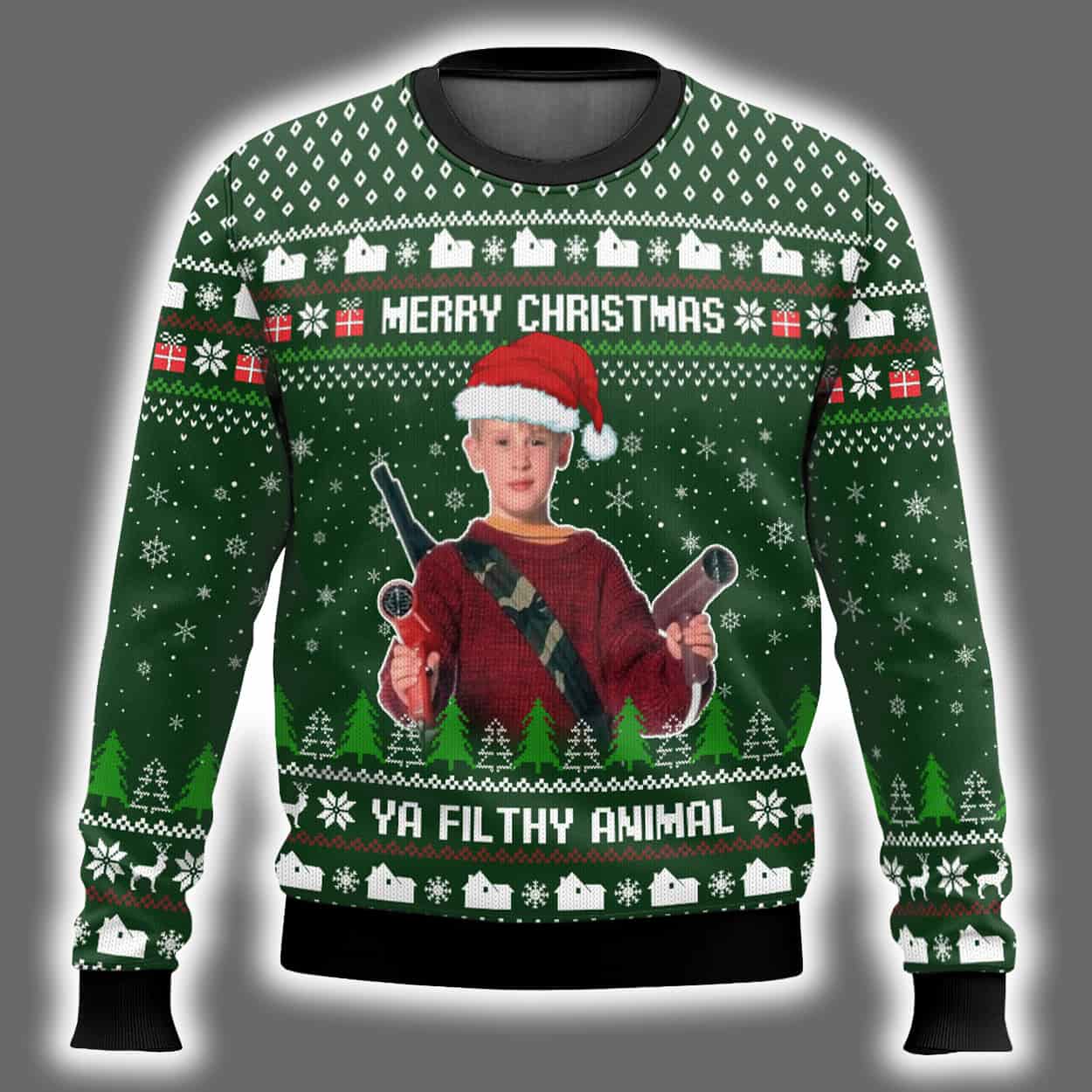 Deck the halls with laughter and nostalgia! This vibrant green sweater is a riot of classic holiday motifs—snowflakes, reindeer, and Christmas trees—wrapped around a cheeky centerpiece: Kevin McCallister in a Santa hat, wielding toy guns with fearless flair. Above him, the bold greeting “MERRY CHRISTMAS” sets the tone, while the unforgettable line “YA FILTHY ANIMAL” below seals the deal. It’s a wearable tribute to one of the most iconic moments from Home Alone, guaranteed to spark smiles and conversations at every holiday gathering.