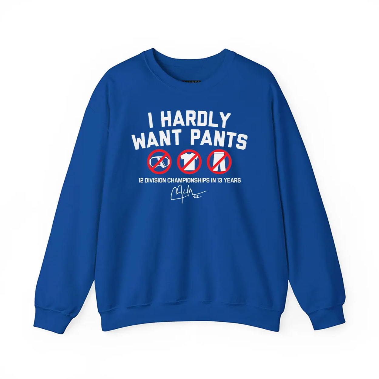Step into the spotlight with this shirt—a hilarious and unapologetically bold tribute to baseball excellence. The front design features the phrase “I HARDLY WANT PANTS” in large, playful lettering, followed by “12 DIVISION CHAMPIONSHIPS IN 19 YEARS,” celebrating a legacy of winning. Below the text, four red-slash icons humorously banish pants, football helmets, footballs, and goalposts—because this shirt is strictly baseball and good vibes. A stylized signature adds a personal touch, making this tee a must-have for fans who love their sports with a side of sass.