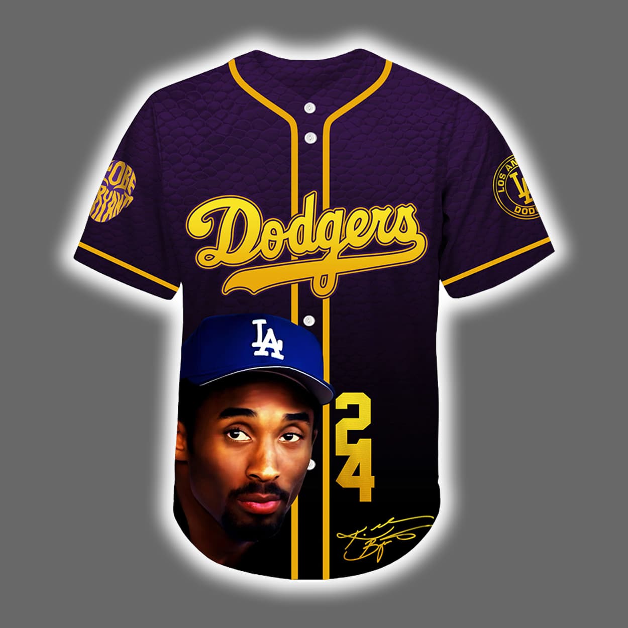 This jersey isn’t just gear—it’s a tribute. This jersey blends the iconic purple and gold of the Lakers with the timeless swagger of the Dodgers. Across the chest, “Dodgers” glows in golden script, while a striking portrait of Kobe in a Dodgers cap anchors the front. His legendary number “24” and signature sit proudly below, reminding fans of his enduring impact. Flip it over and you’ll find “BRYANT” in bold gold, the number “24” coiled with a fierce snake graphic—an homage to the Black Mamba himself. Beneath it, the infinity symbol and “Mamba Forever” seal the message: legends never fade.