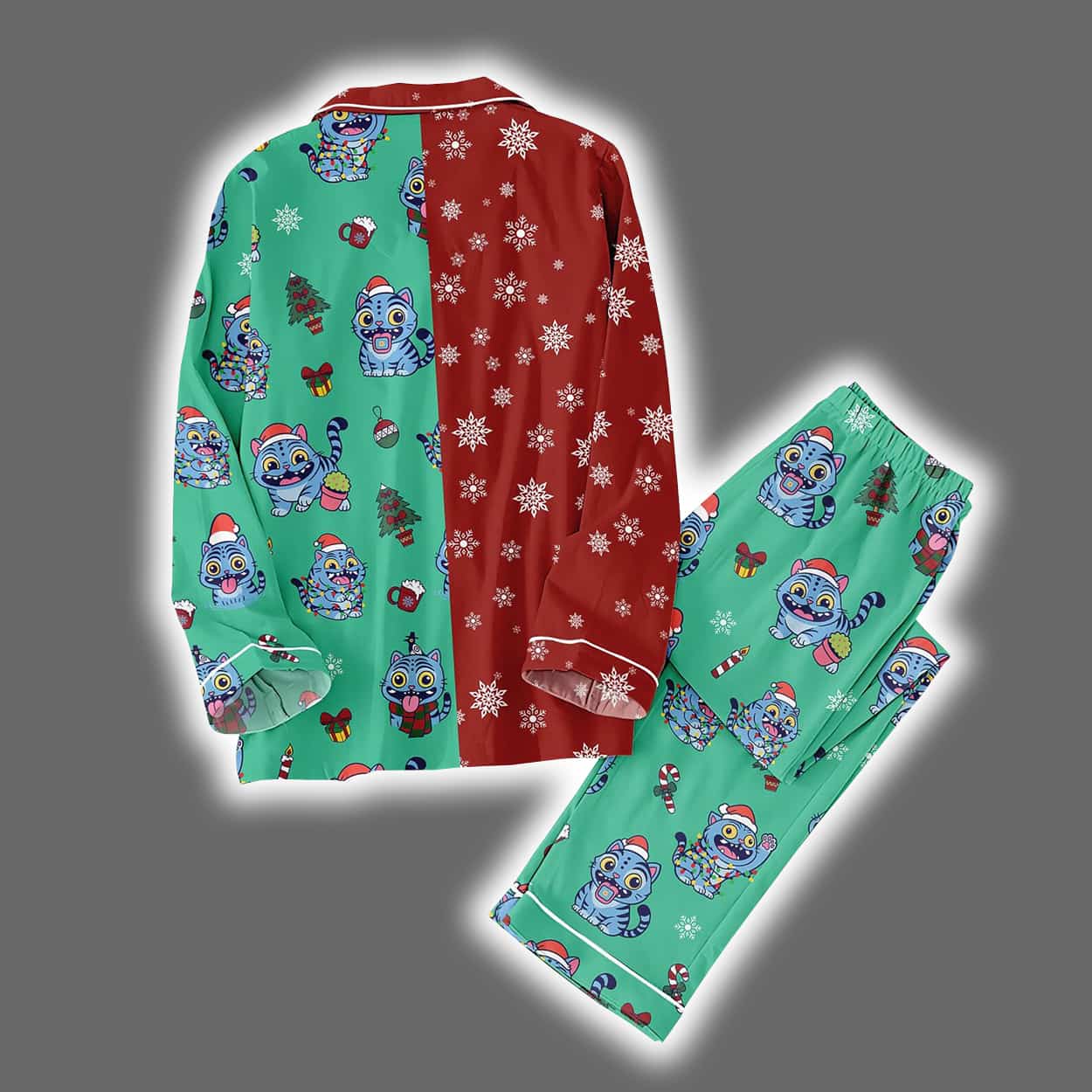 Get ready to sleigh the season with this set—a vibrant, head-turning ensemble that blends holiday cheer with pop culture charm. The pajama top features a split design: one side in classic Christmas red, the other in festive green, sprinkled with snowflakes and a twinkling tree. Front and center is the iconic Blue Tiger character, decked out in a Santa hat, lounging on a red chair with a candy-striped drink in hand. Beneath the chair, wrapped gifts add a touch of seasonal magic. The matching green pants carry the theme with a repeating pattern of the Blue Tiger in various cheeky poses, surrounded by candy canes, snowflakes, and holiday icons.