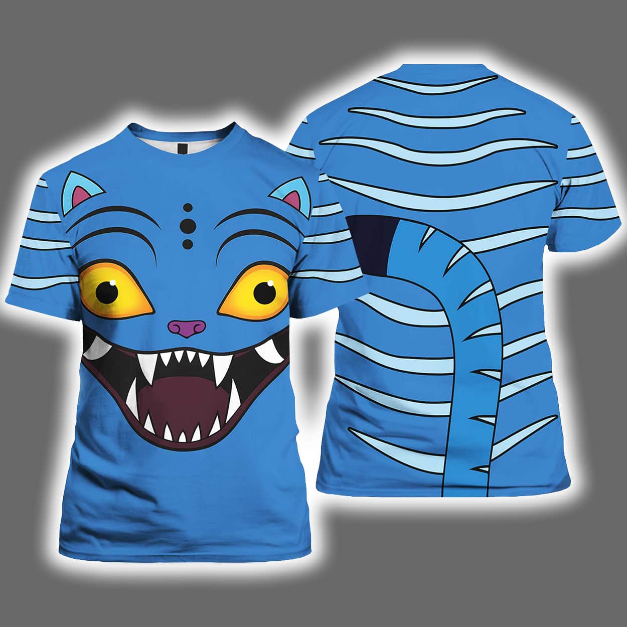 Step into the spotlight with this shirt, a wearable burst of personality that refuses to be ignored. The front features a hilariously exaggerated tiger face—wide yellow eyes, a mischievous grin of sharp white teeth, and a mouth agape in cartoonish chaos. Its blue-striped fur and pink-eared charm give it a delightfully derpy vibe that’s equal parts cute and chaotic. Flip to the back, and you’ll find the tiger’s tail curling upward, completing the full feline fantasy. Whether you’re prowling the streets or dancing at a fan meet, this shirt makes sure all eyes are on you.