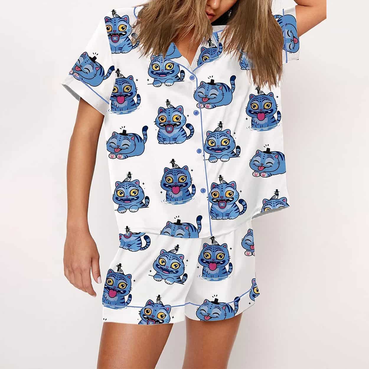 Get ready to pounce into comfort and charisma with this set. This matching short-sleeved shirt and shorts combo features a crisp white base covered in a whimsical cartoon print of a blue tiger with expressive faces and dynamic poses. From wide-eyed surprise to mischievous grins, each tiger adds personality and punch to your lounge look. Accented with bold blue buttons and a relaxed silhouette, this set is perfect for cozy nights, spontaneous selfies, or just vibing with your favorite playlist.