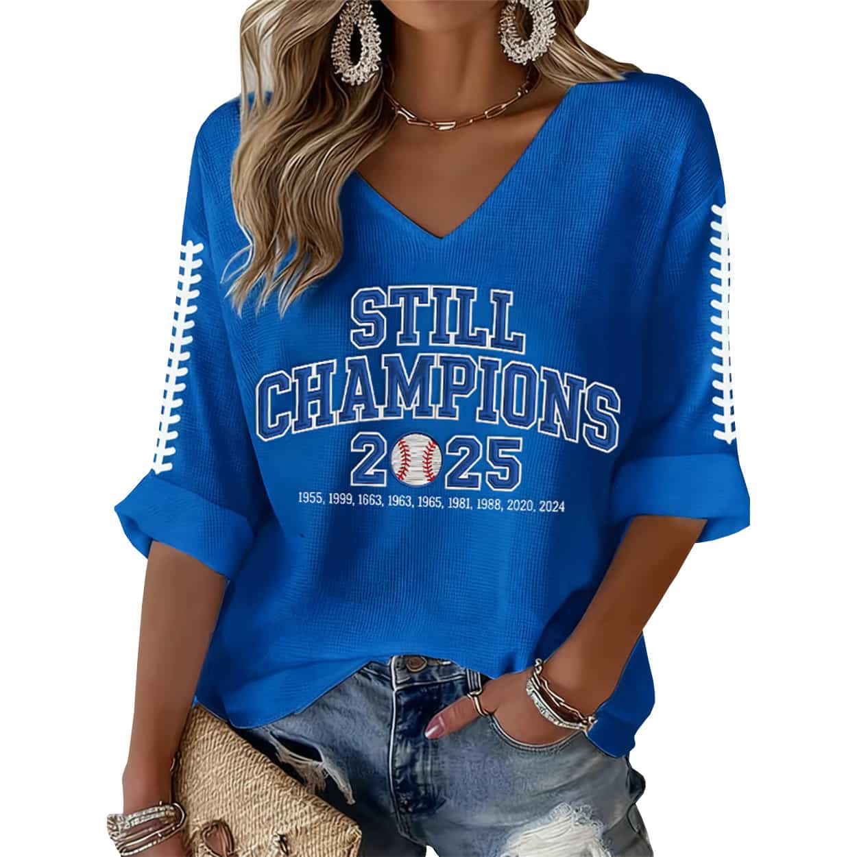Make a statement that echoes through the seasons with this shirt. This vibrant blue V-neck top features crisp white graphics that proudly declare “STILL CHAMPIONS 2025,” flanked by a baseball graphic nestled between the numbers “20” and “25.” Below, a timeline of championship years—1955, 1959, 1963, 1965, 1981, 1988, 2020, and 2024—reminds everyone that the Dodgers don’t just win—they reign. This shirt pairs perfectly with your favorite denim and bold accessories.