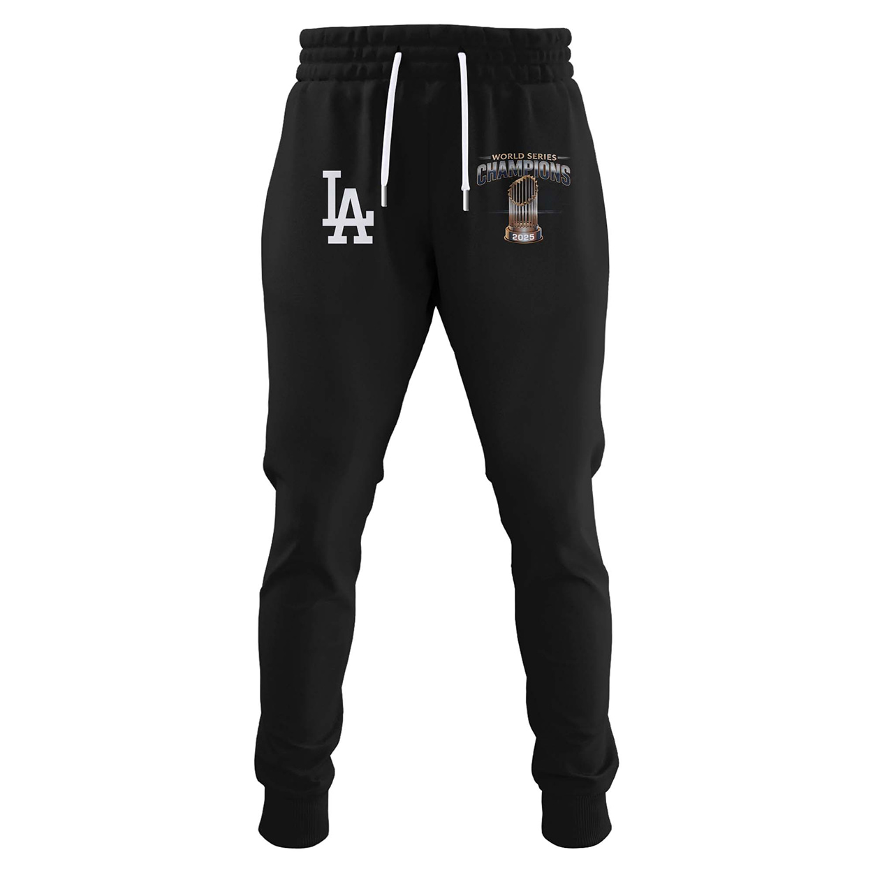 Step out like a champion with this set—featuring a bold hoodie, sleek joggers, and a statement-making cap. The black hoodie showcases “WORLD SERIES CHAMPIONS” above the gleaming Commissioner’s Trophy, stamped with “2025” and the iconic “LA” logo. The sleeves sport commemorative patches, while the back turns heads with a golden laurel wreath, trophy graphic, and player signatures that seal the legacy. The joggers keep the momentum going with matching graphics on each thigh—Dodgers pride on the left, championship glory on the right. Top it off with the cap: a clean black crown featuring the trophy front and center, flanked by “WORLD SERIES CHAMPIONS 2025” in bold white.