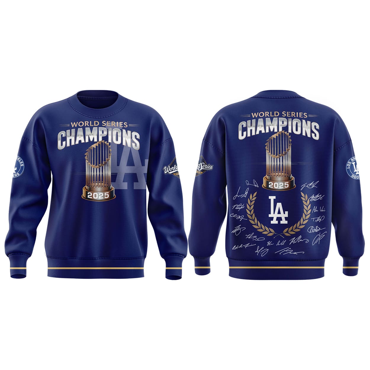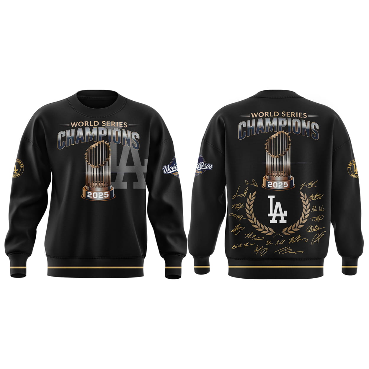 Turn heads and spark conversations with this sweatshirt. This piece is a full-throttle tribute to victory, featuring “WORLD SERIES CHAMPIONS” emblazoned across both the front and back in bold white and gold. The front showcases a towering championship trophy stamped with “2025,” backed by a shadowed “LA” logo that radiates team pride. Flip it around and you’ll find the same trophy front and center, surrounded by golden player signatures and the iconic Dodgers logo—making it feel like you’re wearing a piece of the celebration. With extra graphics on the sleeves, this sweatshirt doesn’t miss a beat.