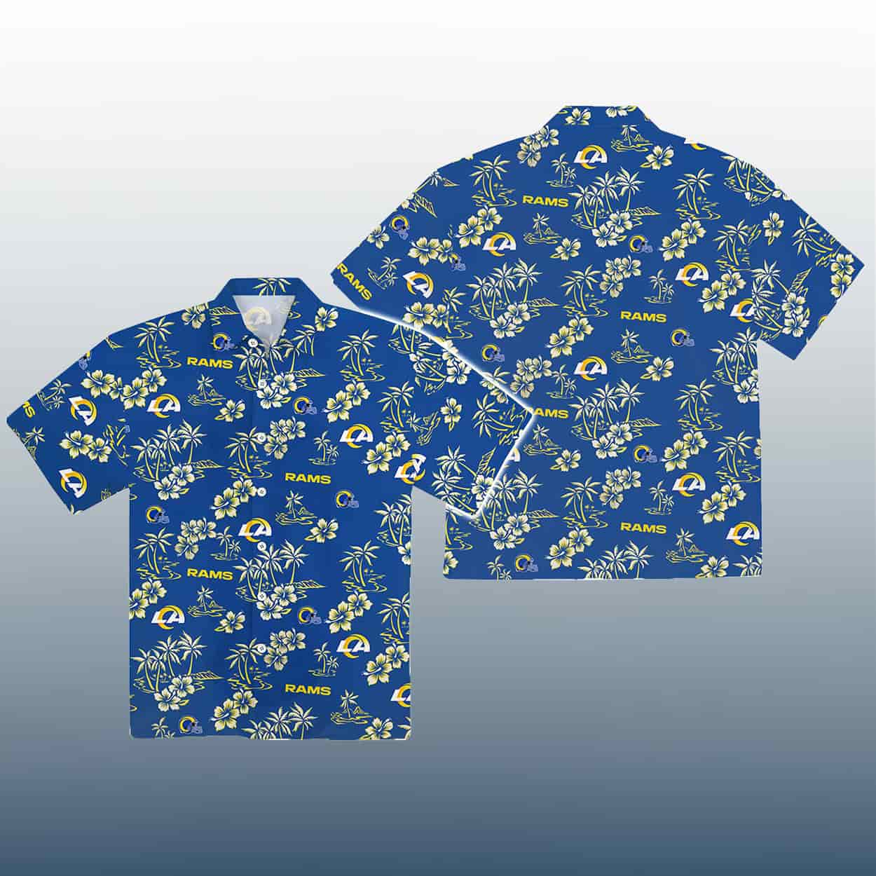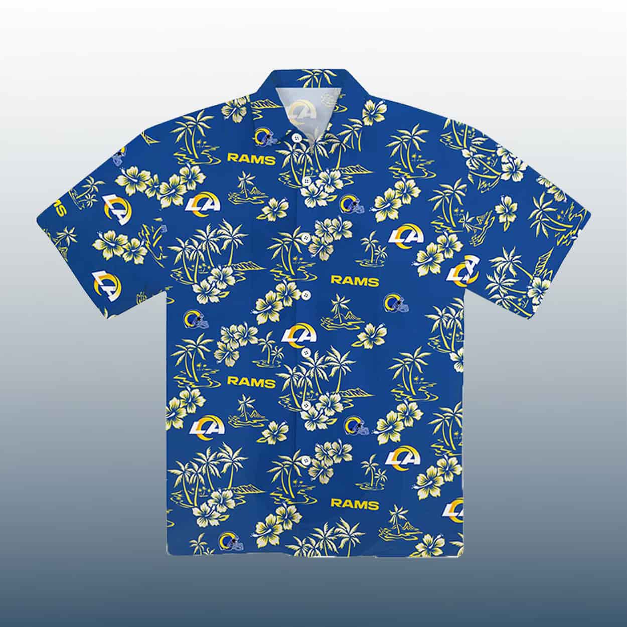 Say aloha to your new favorite game-day gear. This electric blue button-up bursts with tropical energy, featuring a lush pattern of palm trees and hibiscus flowers that scream vacation mode. But don’t let the laid-back look fool you—it’s all Rams, all the time. Scattered across the shirt are bold “RAMS” text and the team’s iconic logo, making it clear you’re repping LA’s finest. Whether you’re tailgating in paradise or just bringing the beach to the bleachers, this shirt is a touchdown in style.