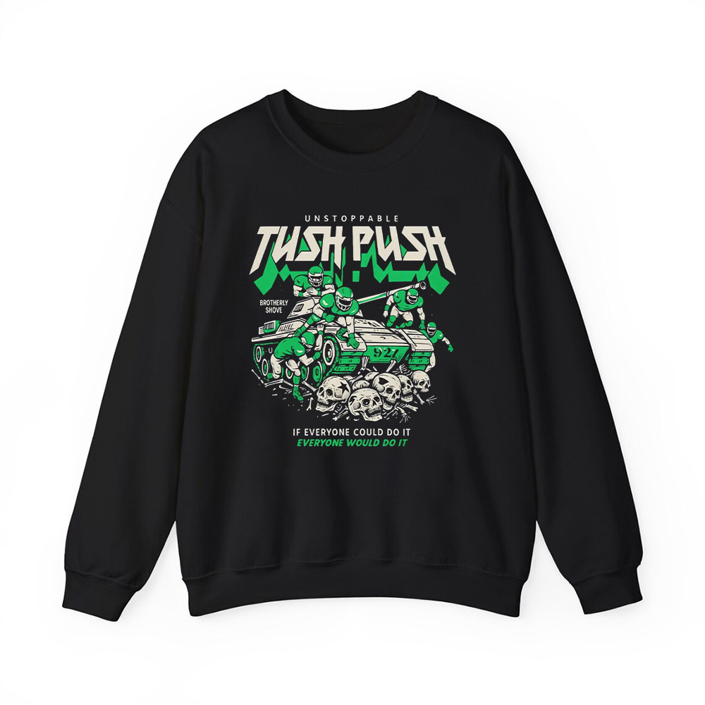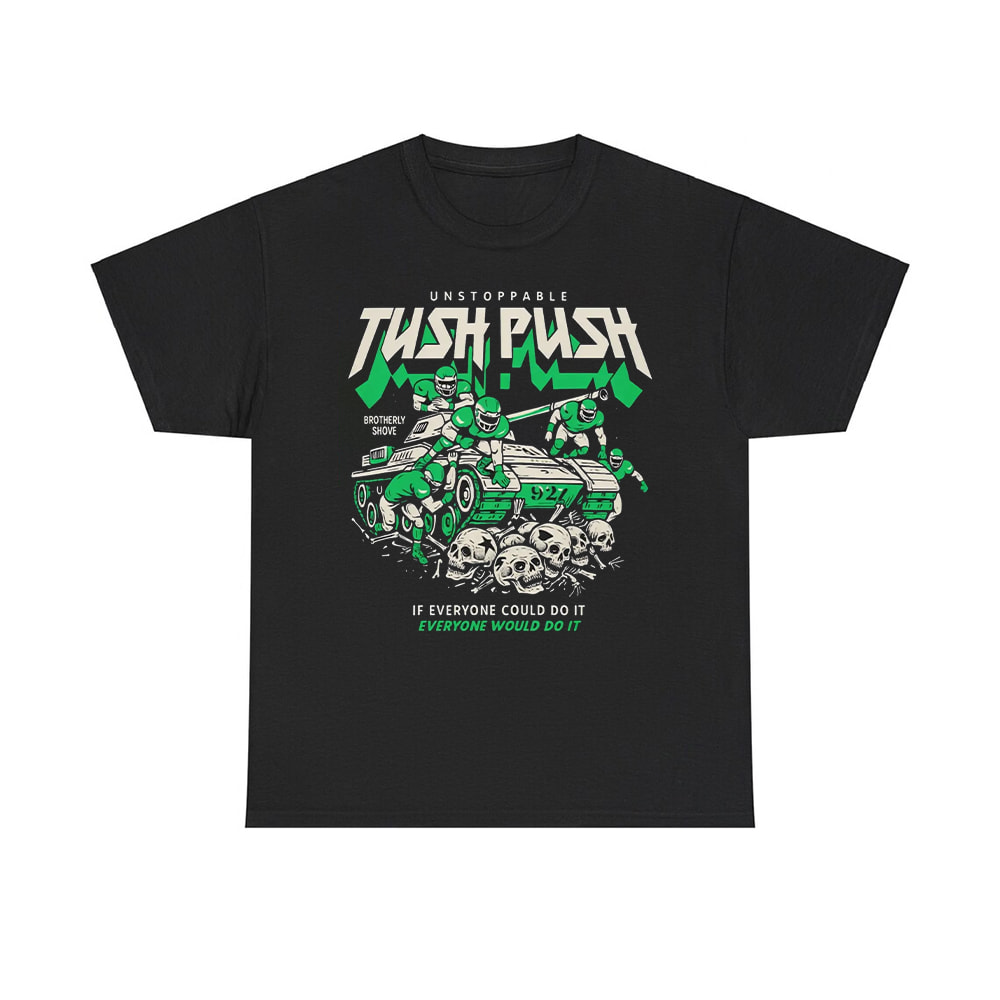 This isn’t just a shirt—it’s a battle cry. Featuring two Eagles players in fierce green uniforms charging forward atop a tank, this graphic captures the raw power of the infamous “tush push” play. Beneath the tank, a pile of skulls adds a cheeky nod to the trail of defeated defenses left in its wake. Above the scene, bold lettering declares “UNSTOPPABLE TUSH PUSH,” while the bottom line drives it home: “IF EVERYONE COULD DO IT, EVERYONE WOULD DO IT.” It’s a visual mic drop for fans who know dominance when they see it.