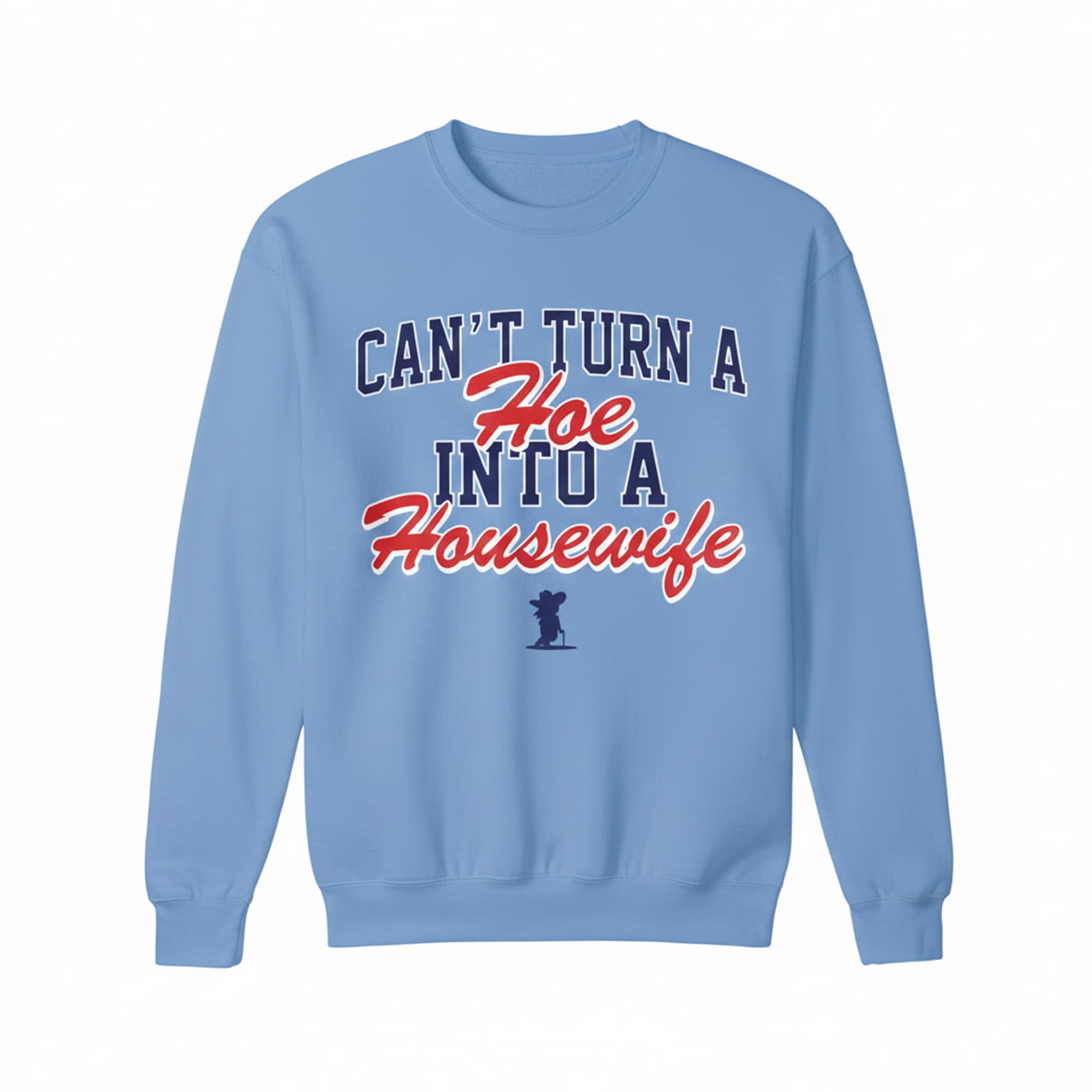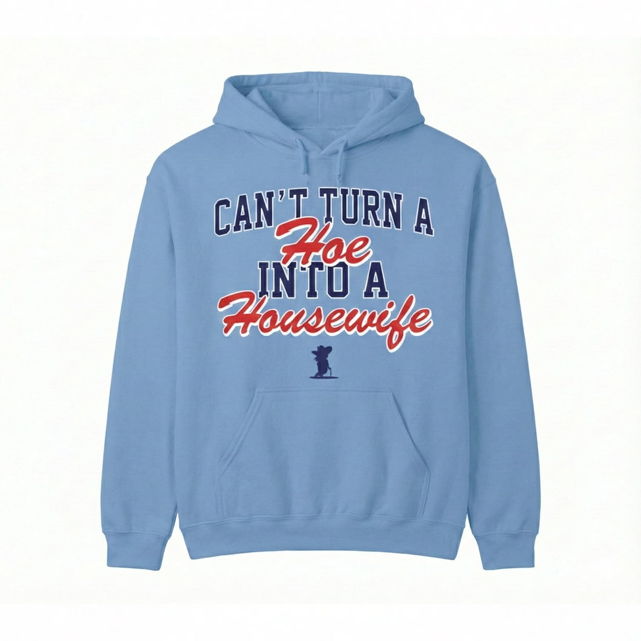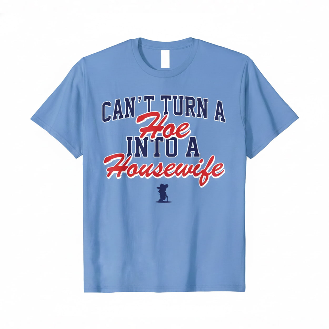 This light blue tee doesn’t just make a statement—it starts a conversation. Featuring the phrase “CAN’T TURN A Hoe INTO A Housewife” in bold navy and cursive red fonts, it’s a cheeky nod to one of the most talked-about moments in college football culture. A silhouette of a woman in a dress adds a visual punch beneath the text, balancing humor with a dash of irony. Whether you’re tailgating, podcasting, or just stirring the pot, this shirt brings the heat.