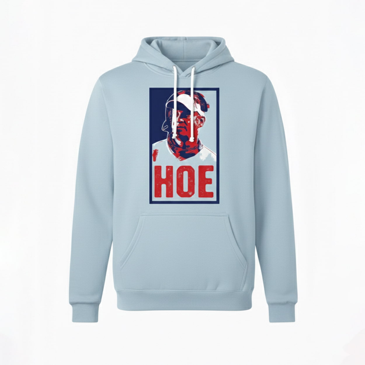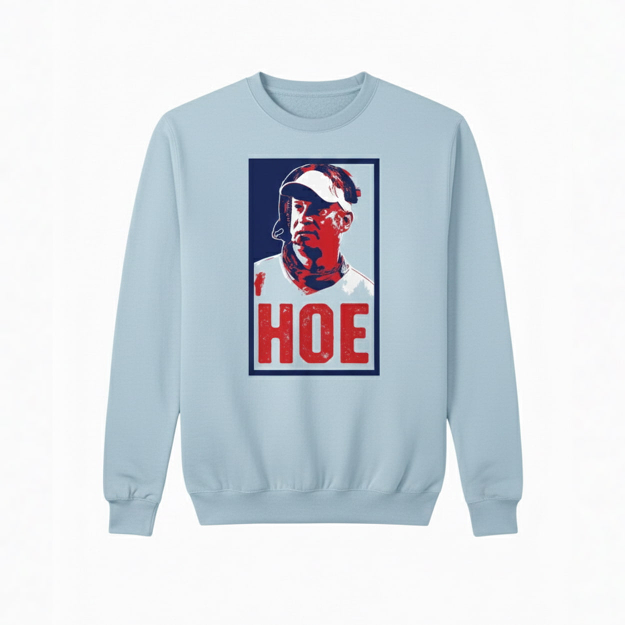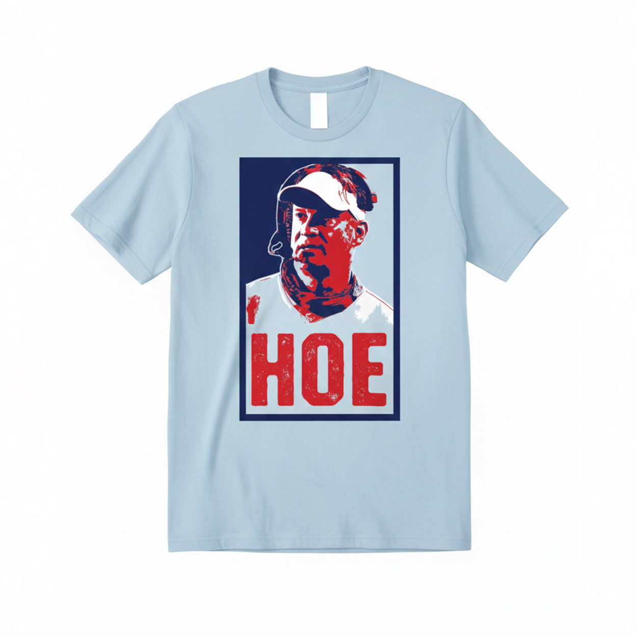 This shirt is not your average fan gear—it’s a pop culture punchline wrapped in red, white, and blue. Featuring a stylized portrait of Lane Kiffin in a headset and visor, the design mimics the iconic “Hope” poster aesthetic but flips the narrative with one word: “HOE.” Framed in a bold blue border and splashed across a light blue tee, this graphic is equal parts satire and swagger, perfect for those who love their sports with a side of snark.