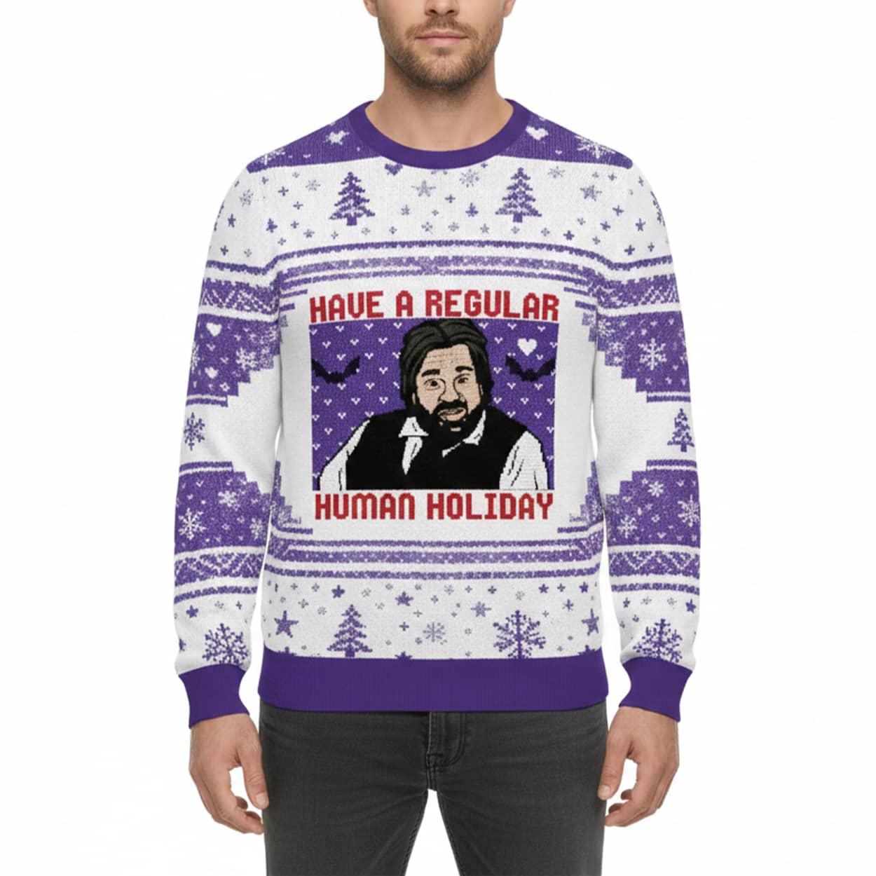 Step into the season with a sweater that’s anything but ordinary. This sweater is a glorious mashup of traditional festive patterns and supernatural satire. Featuring a bold purple and white palette, it’s adorned with snowflakes, hearts, and Christmas trees—classic symbols of holiday warmth. But the centerpiece steals the show: a sharply dressed man with a dark beard and piercing gaze, unmistakably Laszlo from What We Do in the Shadows, framed by the hilariously deadpan phrase “HAVE A REGULAR HUMAN HOLIDAY.” It’s cozy, cheeky, and guaranteed to raise eyebrows at any holiday gathering.