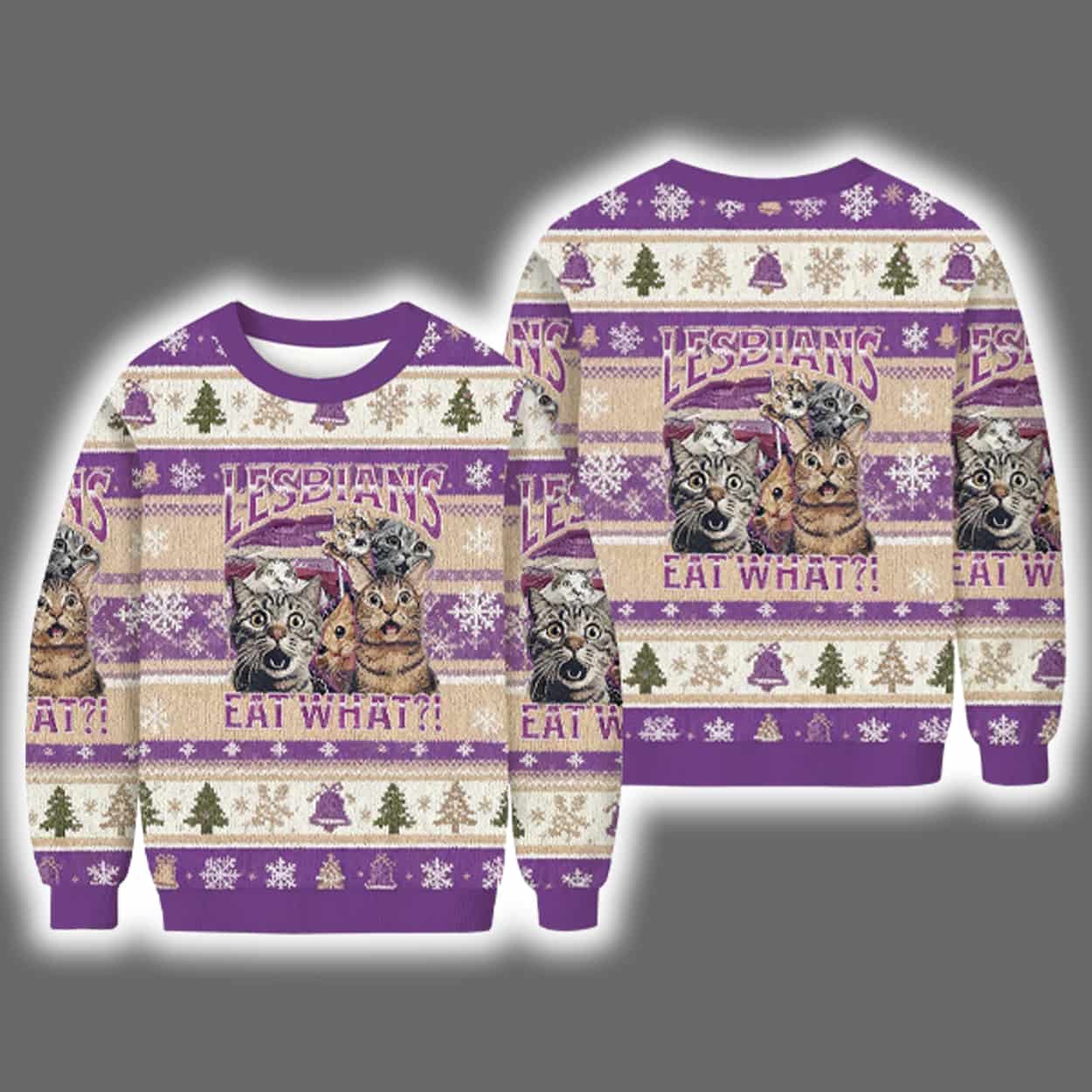 This isn’t your grandma’s Christmas sweater. With a vibrant red, white, and beige palette, it features a trio of adorable cats decked out in festive gear—Santa hats, scarves, and all—posing proudly beneath the eye-catching phrase “LESBIANS” and the punchline “EAT WHAT?!”. Surrounded by classic holiday motifs like snowflakes, bells, and Christmas trees, the design blends cozy seasonal vibes with a daring sense of humor. Whether you’re attending an ugly sweater party or just want to make your friends spit out their cider laughing, this sweater delivers maximum impact with minimal subtlety.