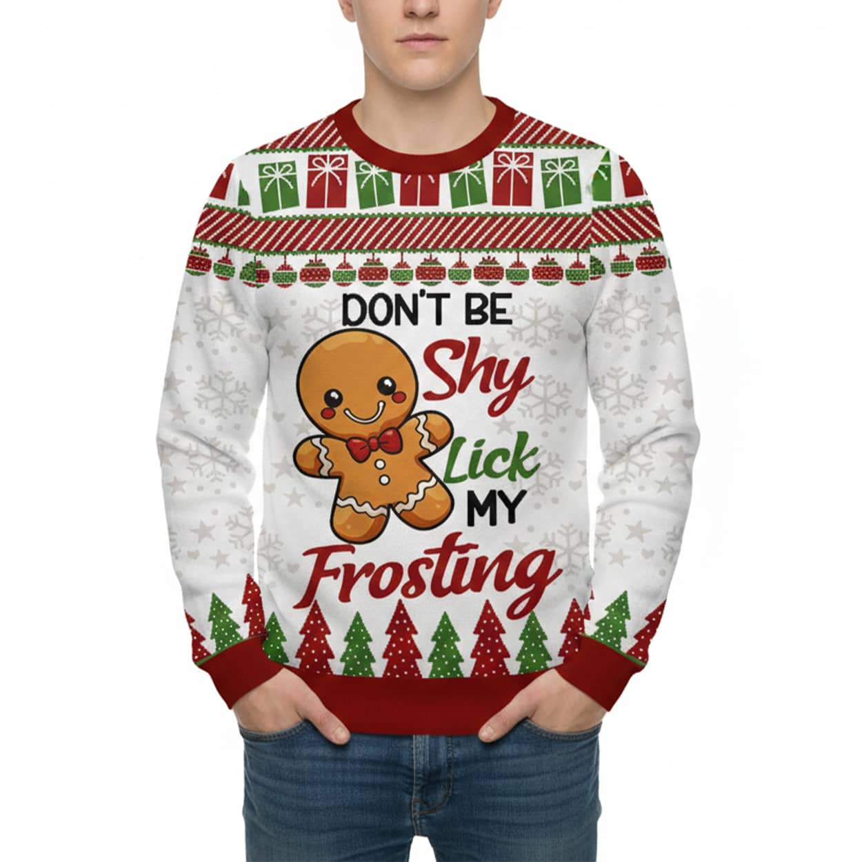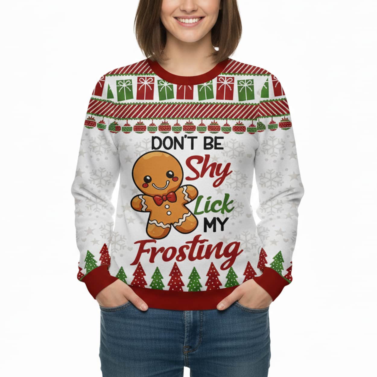 Turn heads and stir giggles with this sweater—a festive explosion of color, charm, and unapologetic sass. This holiday-ready sweater features a cheerful cartoon gingerbread man sporting a red bow tie, surrounded by classic Christmas icons like trees, ornaments, and gift boxes. But the real showstopper? The playful phrase “DON’T BE Shy Lick MY Frosting” sprawled across the chest in bold, multicolored lettering. With red accents at the collar and cuffs and a snowy backdrop, it’s the perfect blend of cozy and provocative.