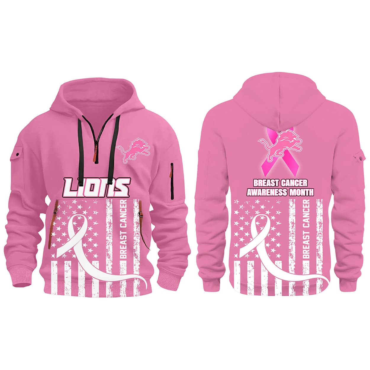 This hoodie is pink with a purpose. On the front, “LIONS” stands tall in bold white letters, crowned by a fierce lion logo that radiates strength. Just below, a white breast cancer ribbon is print into a stylized American flag, with vertical stripes and stars that carry the words “BREAST CANCER” like a badge of honor. Flip it around and the back continues the tribute: a pink ribbon with the lion emblem above the same flag design, anchored by the powerful phrase “BREAST CANCER AWARENESS MONTH.” It’s a quarter zip that zips up warmth and zips out silence—because awareness deserves to be loud.