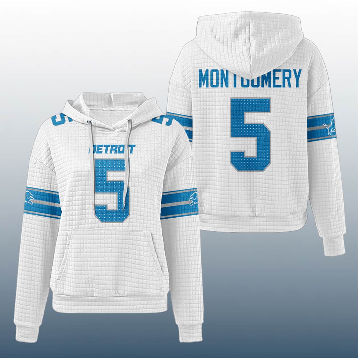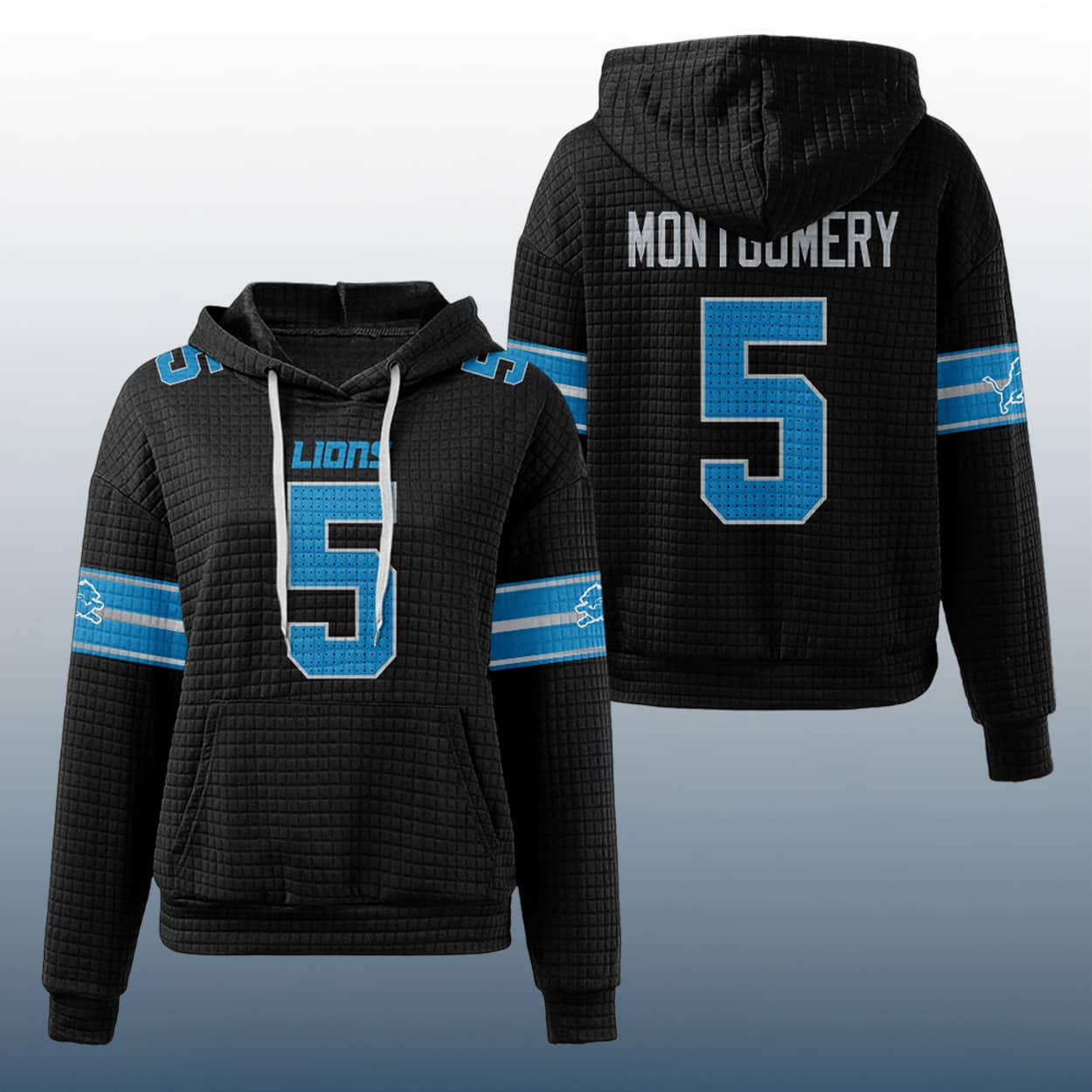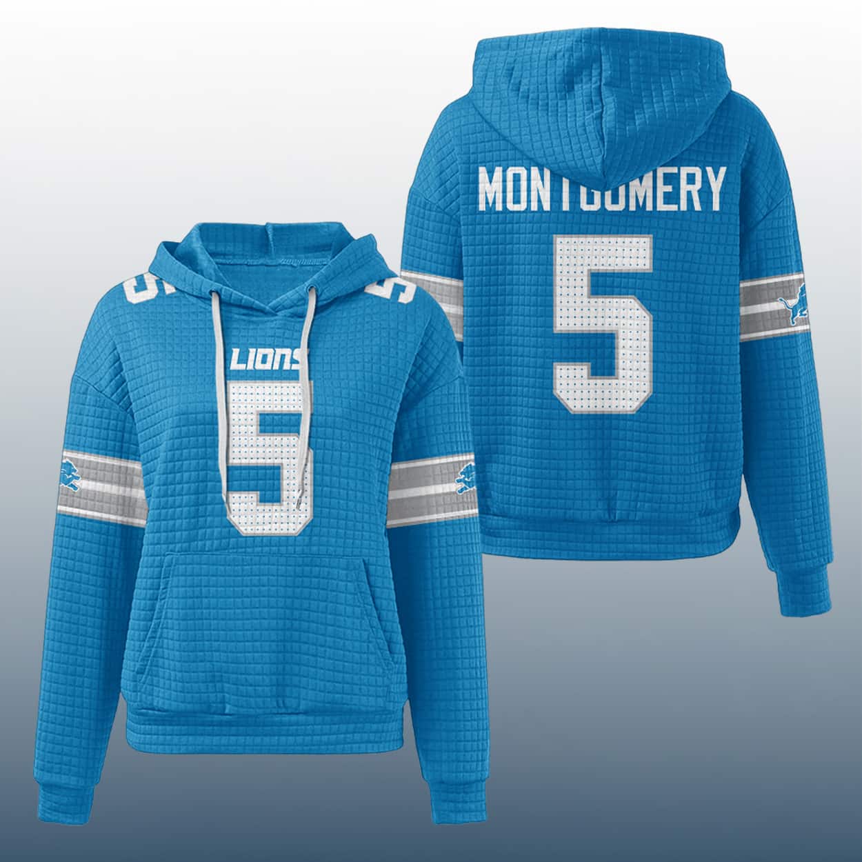 Step into the zone with this hoodie—a bold tribute to Detroit’s dynamic running back. This blue quilted hoodie brings jersey vibes with a front-and-center number “5” in large white block letters, complete with a perforated pattern that screams game-ready. “LIONS” sits proudly above the number, while the back features “MONTGOMERY” in bold white lettering above another big “5.” The sleeves are decked out with white and gray stripes and the unmistakable Lions logo, adding a fierce finish to this fan-favorite look.