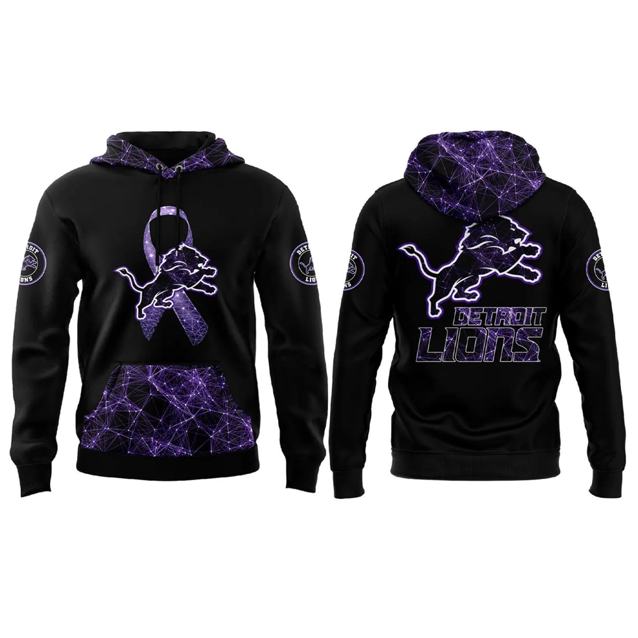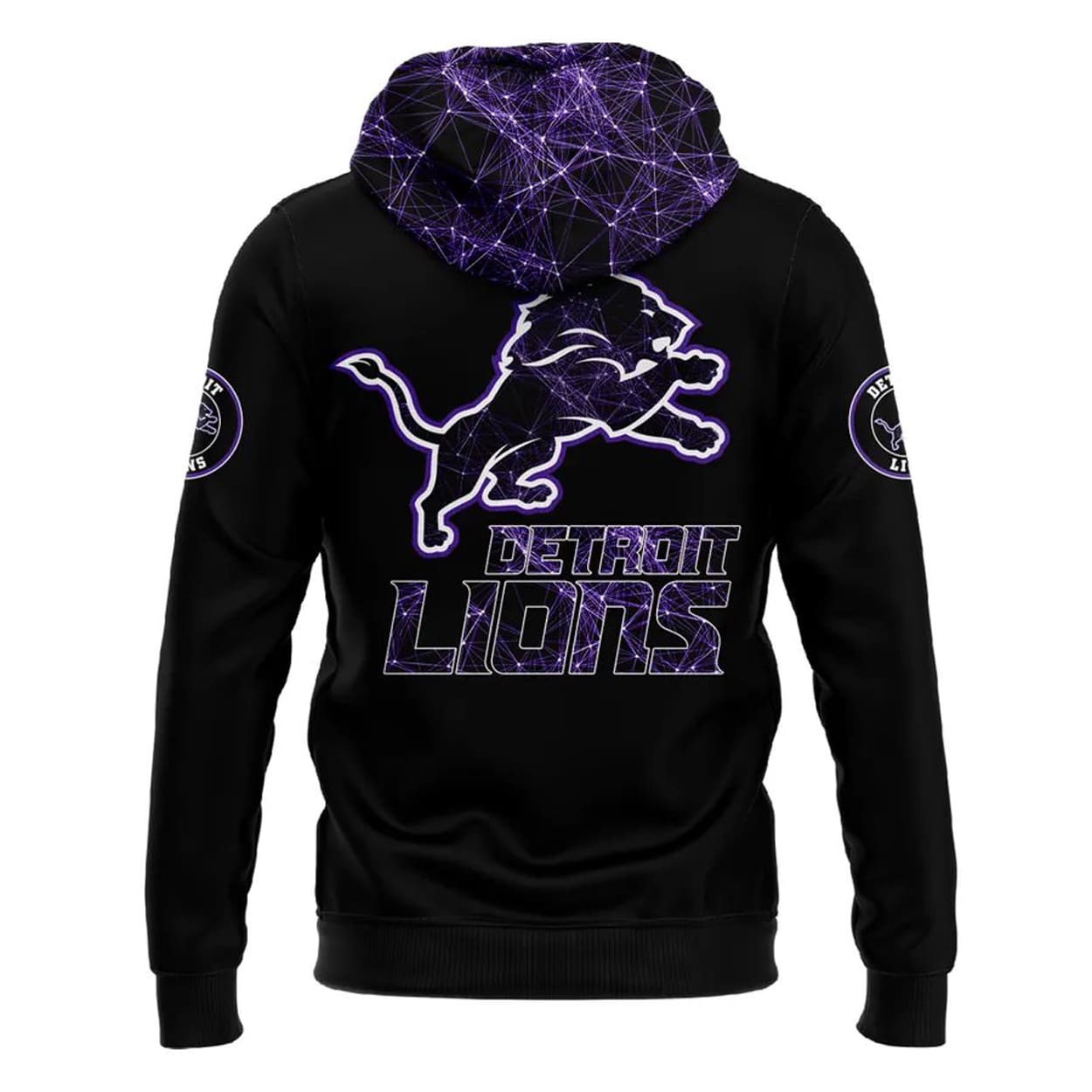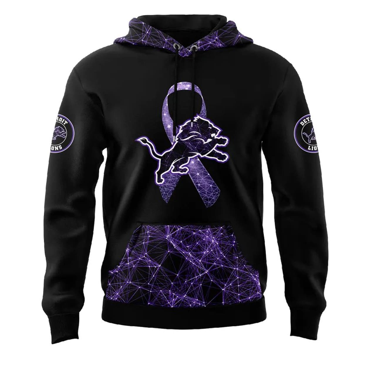 Turn heads and spark conversations with this hoodie. This striking black hoodie is charged with a vibrant purple and white electric pattern that surges across the hood, sleeves, and lower panels. On the front, a dynamic ribbon design features the Lions’ iconic leaping lion bursting through—symbolizing strength, resilience, and support. Circular lion emblems on the sleeves add extra team pride, while the back showcases a bold “LIONS” graphic beneath the powerful lion logo, framed by electrifying streaks that amplify the energy of the message.