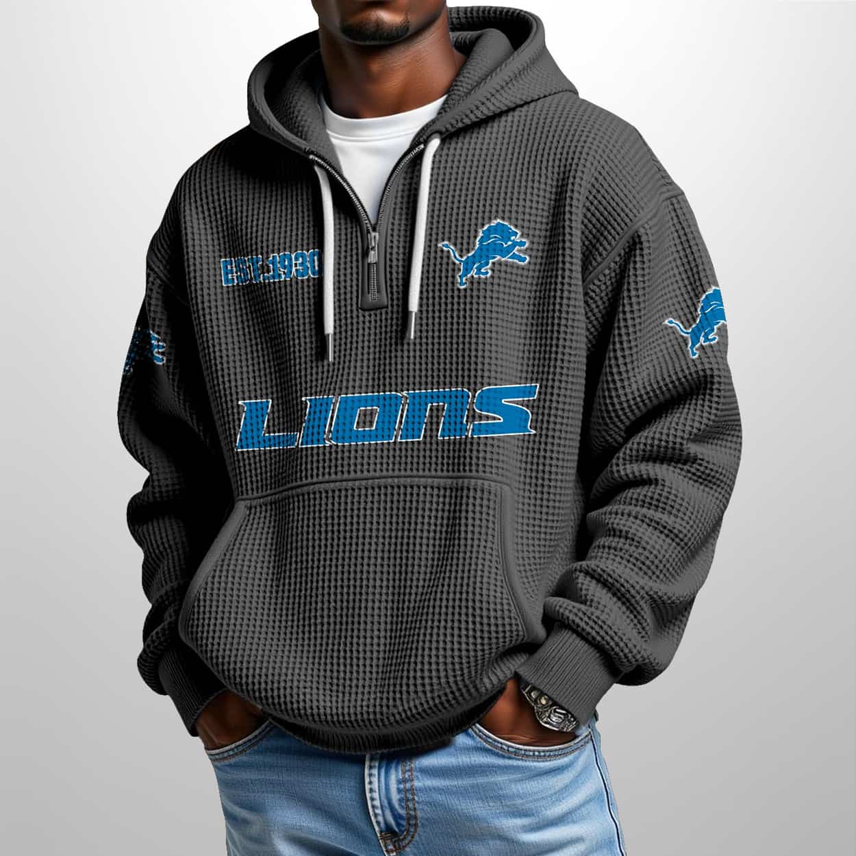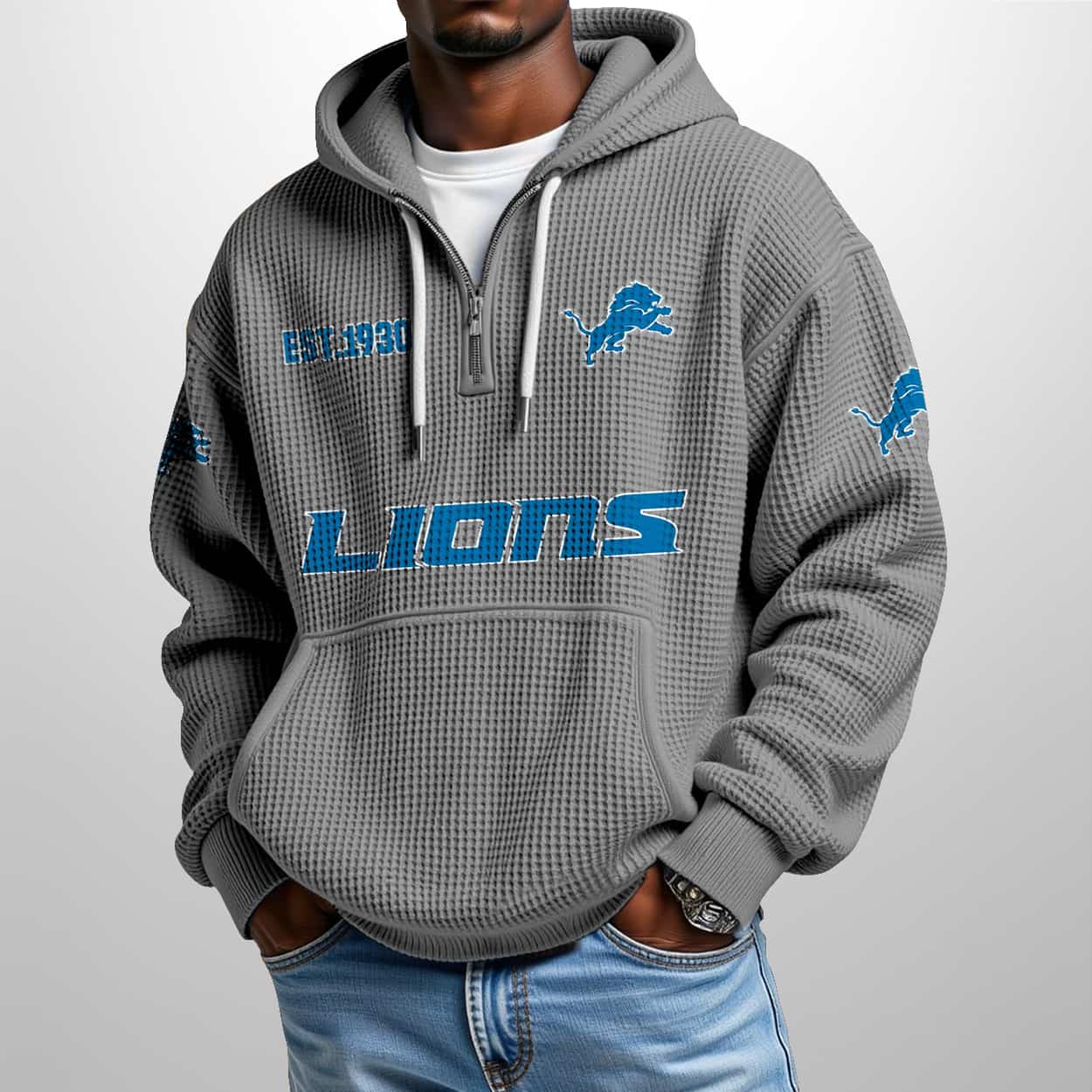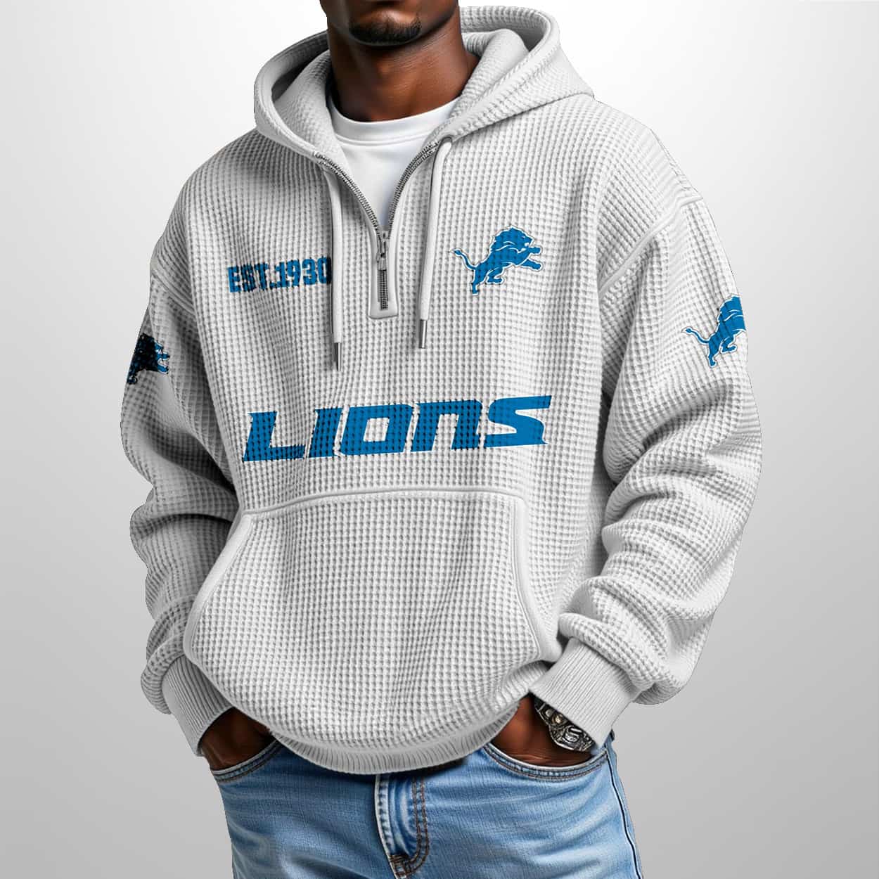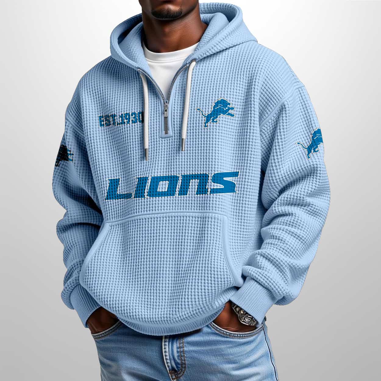This Lions Est 1930 Half Zip Waffle Hoodie features premium waffle-knit fabric for warmth and breathability, a quarter-zip closure, adjustable drawstrings, and a kangaroo pocket. The design includes “EST. 1930” embroidery, a central leaping lion logo, “LIONS” bold scripting, and sleeve patches with additional lion emblems, available in light blue for versatile styling.