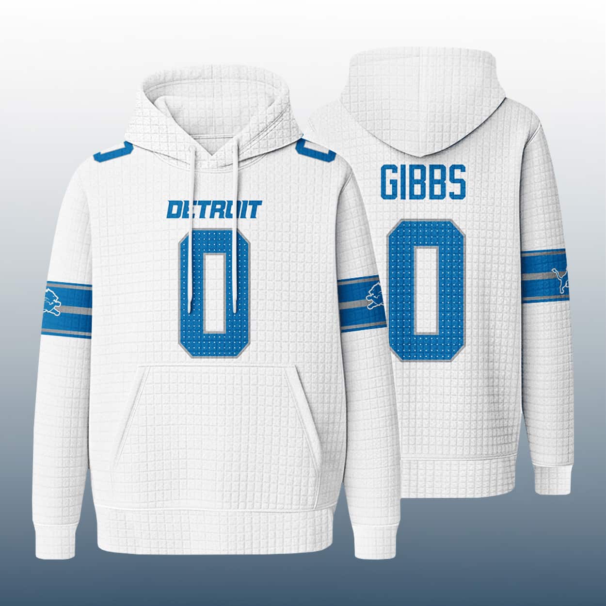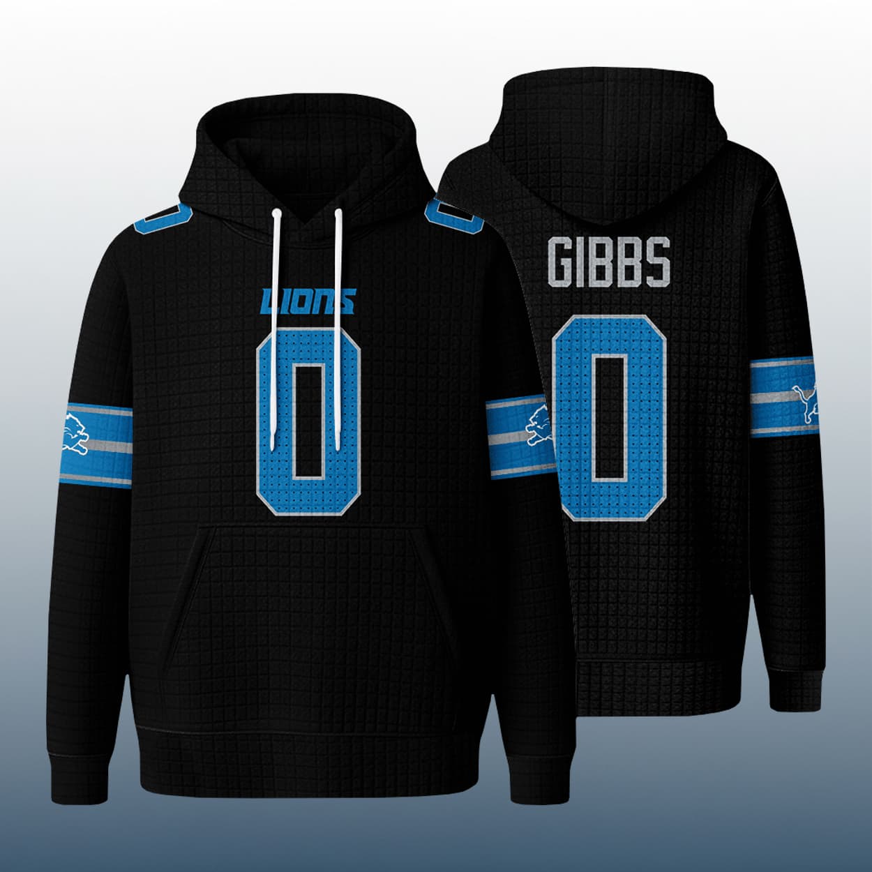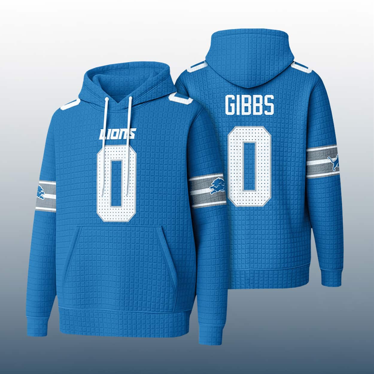Unleash your inner playmaker with this hoodie—a dynamic blend of football energy and streetwear edge. This hoodie rocks a bold blue base with crisp white “LIONS” lettering across the chest and a standout number “0” front and back. The name “GIBBS” sits proudly above the rear number, making it clear who you’re backing. Both sleeves feature white and gray stripes and the iconic leaping lion logo, adding extra Detroit flavor. With a textured waffle pattern, front pouch pocket, and white drawstrings, this hoodie is built for comfort and swagger.