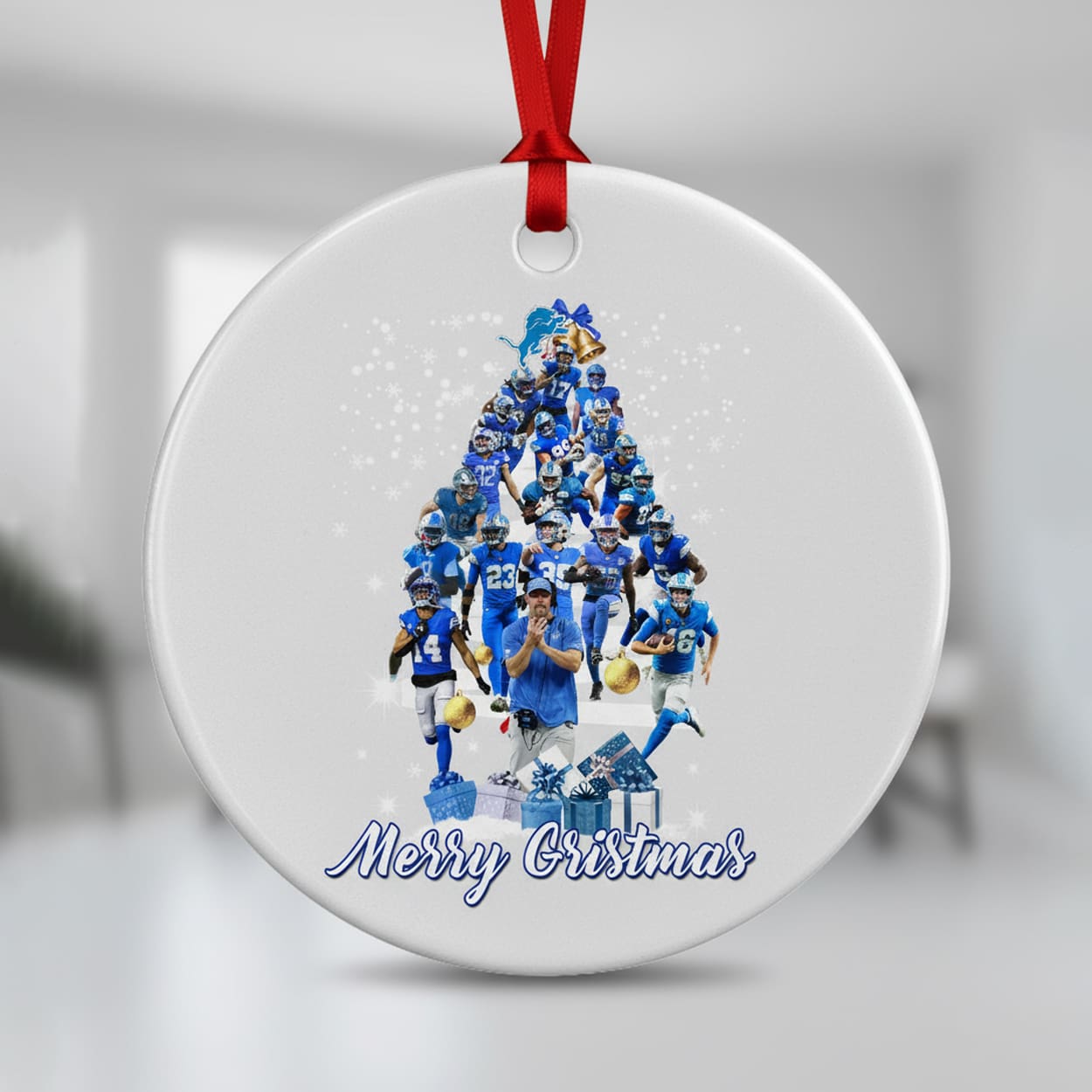 Deck the halls with Lions pride! This round white ornament features a playful and powerful design: a group of Lions players in bold blue uniforms stacked in the shape of a Christmas tree. Snowflakes swirl around them, adding a wintry sparkle, while wrapped gift boxes sit beneath the tree like trophies of triumph. At the base, the phrase “Merry Gristmas” is written in a festive font that pops with seasonal joy. Hanging from a bright red ribbon, this ornament is a celebration of grit, glory, and gridiron greatness.