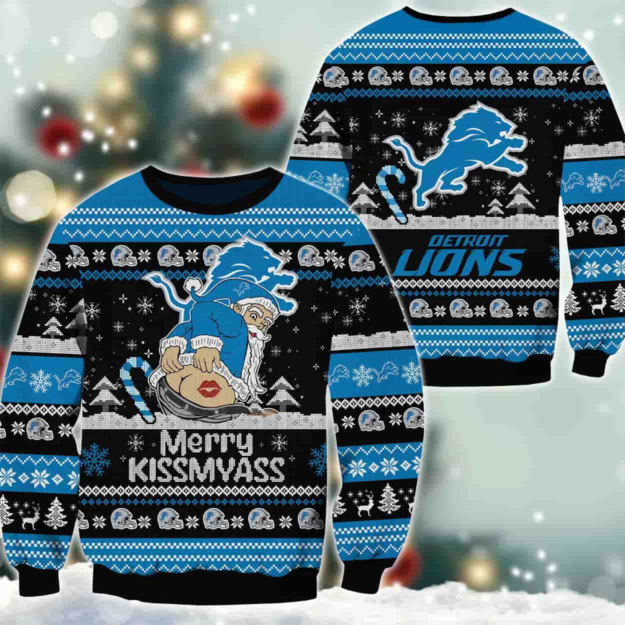 Get ready to sleigh the season with this sweater, a festive masterpiece that blends team pride with outrageous humor. The front showcases a cartoon Santa Claus in a hilariously daring pose—pants down, bare buttocks out, and a lipstick kiss mark stamped right. Beneath this unforgettable image, the phrase “MERRY KISSMYASS” delivers the ultimate holiday mic drop. Surrounding the scene are classic Christmas patterns—snowflakes, reindeer, and trees—all decked out in the Lions’ signature blue, black, white, and gray. The back features the team’s logo and name, so no one will question where your loyalty lies.
