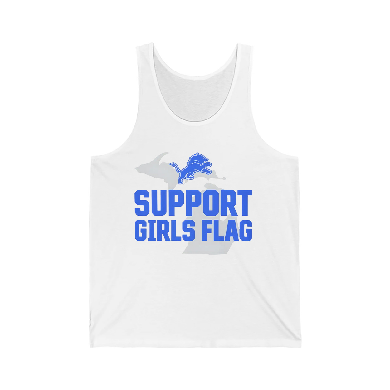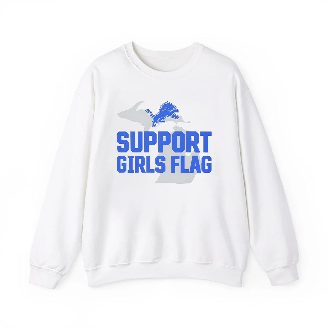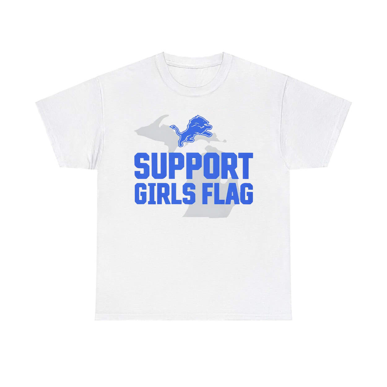 Step into the spotlight with this shirt, a bold fusion of fandom and advocacy. This eye-catching tee features the iconic blue Detroit Lions logo proudly perched atop a subtle grey silhouette of Michigan—because where better to champion change than the heart of the Motor City? Beneath the emblem, the phrase “SUPPORT GIRLS FLAG” bursts forth in confident blue block letters, making your stance unmistakably clear: you’re here to cheer for every girl who’s ready to run the field.