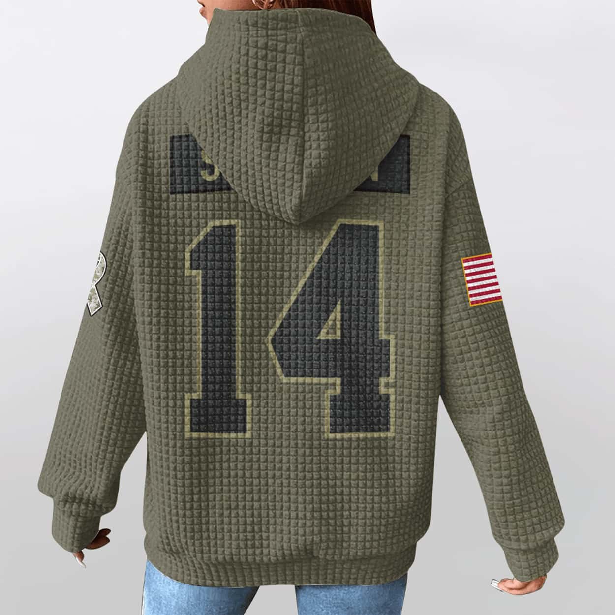 This hoodie isn’t just apparel—it’s a salute. The military tones and structured grid pattern echo the discipline and strength of those who serve, while the bold numerals and nameplate honor one of Detroit’s fiercest playmakers. It’s for fans who stand tall, think big, and wear their values loud.
