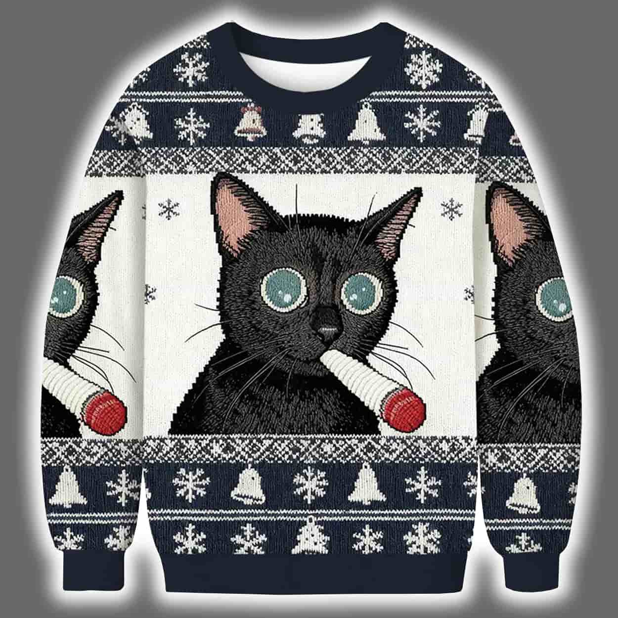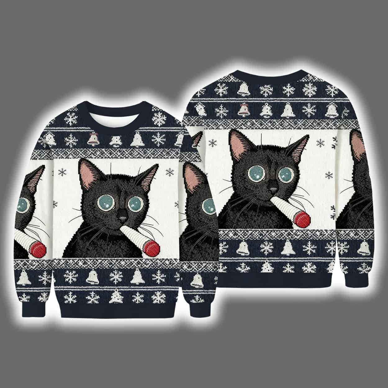 Get ready to sleigh the season with this unapologetically quirky sweater! Front and center is a wide-eyed black cat clutching a red-and-white party horn in its mouth, giving off major “caught in the act” vibes. The festive backdrop features a symmetrical spread of snowflakes, Christmas trees, and winter icons in crisp white against a deep navy canvas. The design wraps around the sweater, making the mischievous feline visible from every angle—because why should the fun stop at the front?