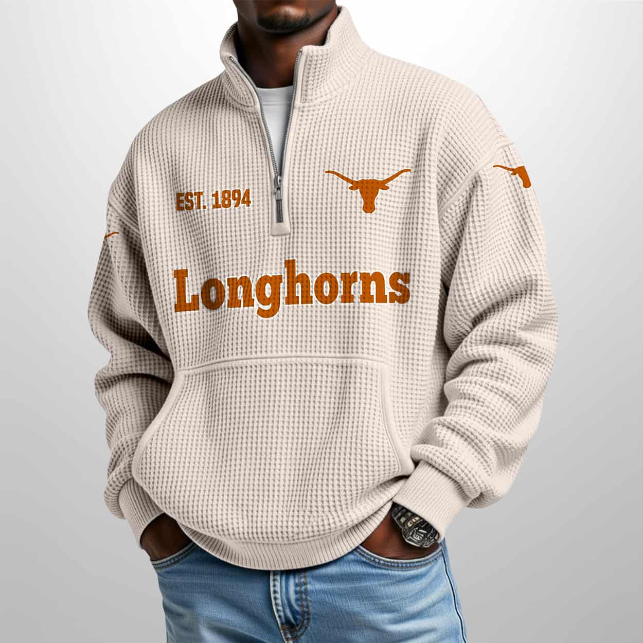Saddle up for standout style with this sweatshirt—a pullover that blends classic comfort with unmistakable school pride. This beige quarter-zip features a textured waffle design and a sleek stand collar for a clean, confident look. Front and center, “Longhorns” stretches across the chest in bold burnt orange, flanked by “EST. 1894” and the iconic Longhorn logo. The right chest and left sleeve also sport the Longhorn emblem, making sure your Texas spirit is visible from every angle.