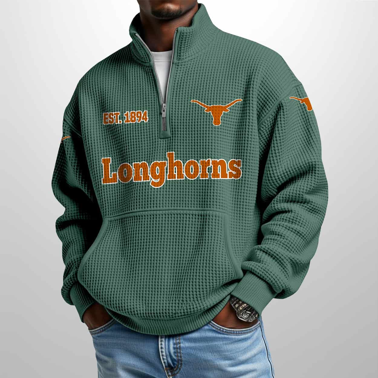 Be the first to review “Longhorns Est 1894 Waffle Stand Collar Half Zip Sweatshirt” Cancel reply
