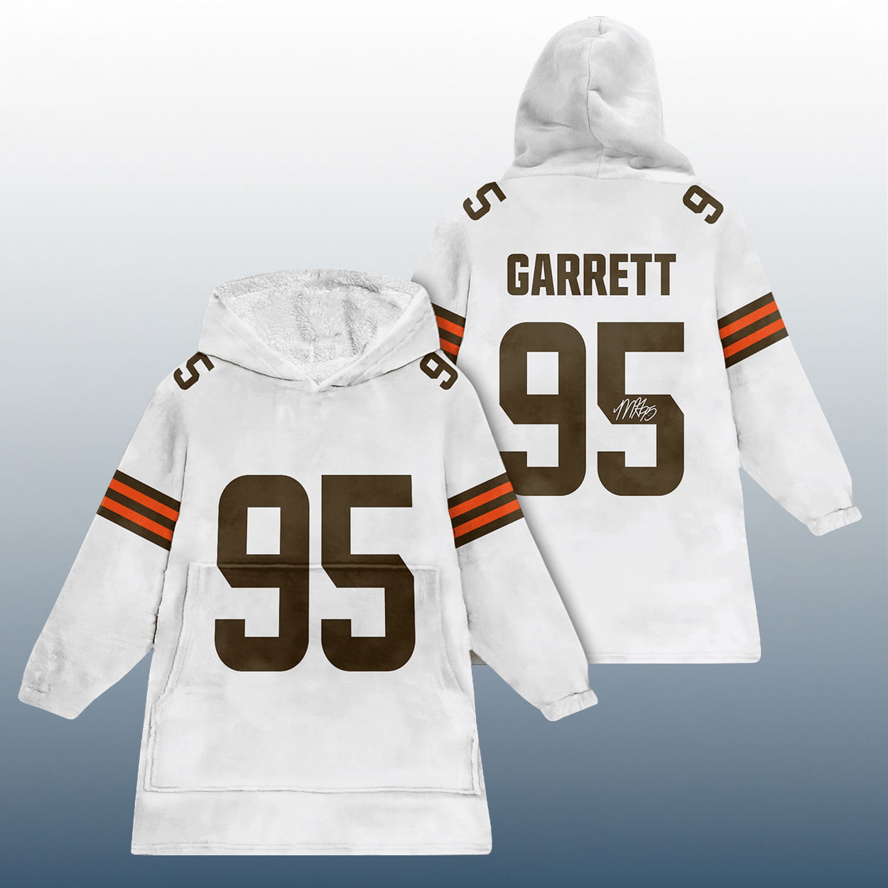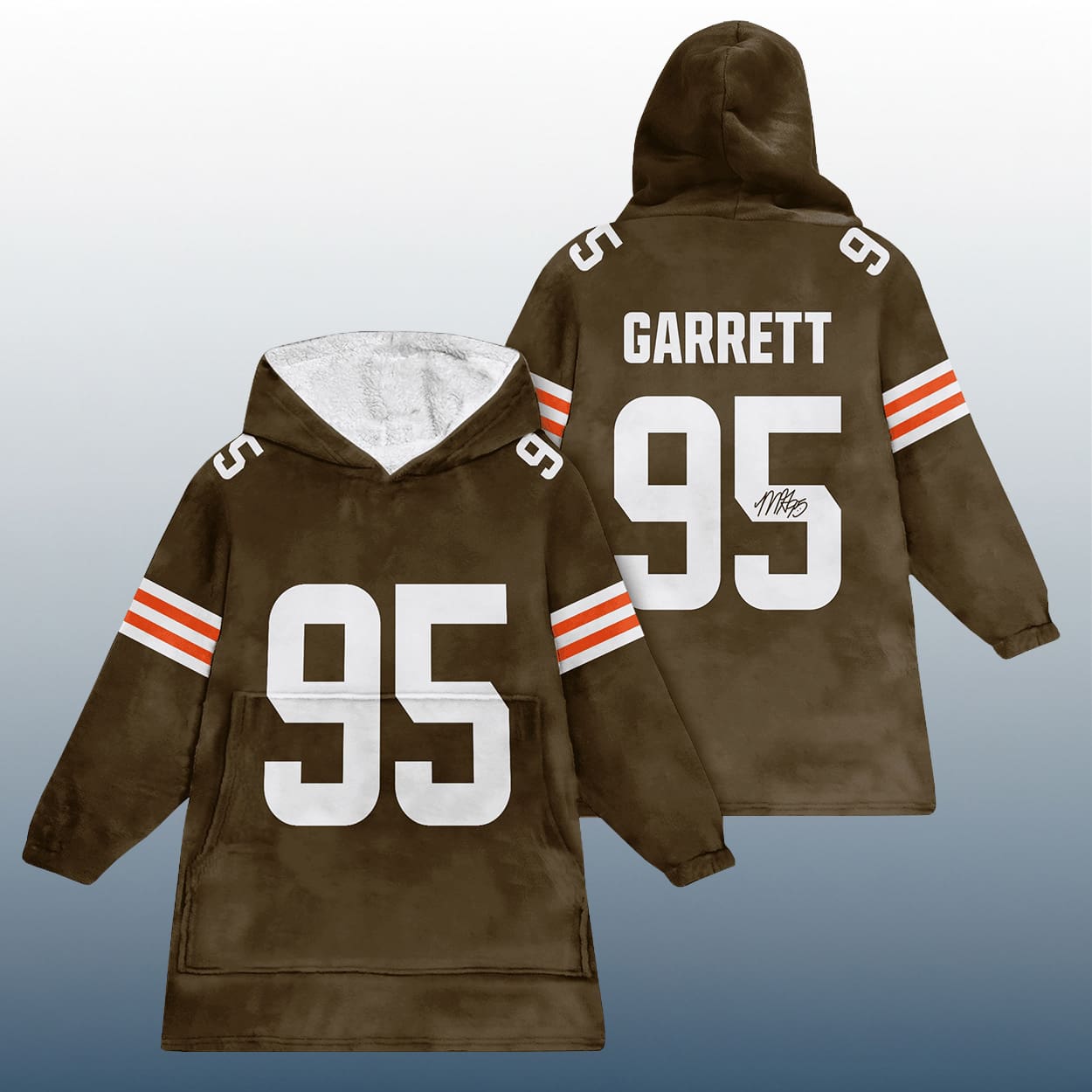 Get ready to huddle up in ultimate fan fashion with this hoodie. This hoodie brings the energy of the gridiron to your everyday look. With the number “95” boldly printed on both front and back, and “GARRETT” printed across the shoulders, it’s a wearable shoutout to one of Cleveland’s fiercest defenders. The brown base is accented with crisp white and orange sleeve stripes, while the hood’s white lining adds a clean contrast that pops. Whether you’re cheering from the stands or lounging at home, this hoodie delivers MVP-level vibes.