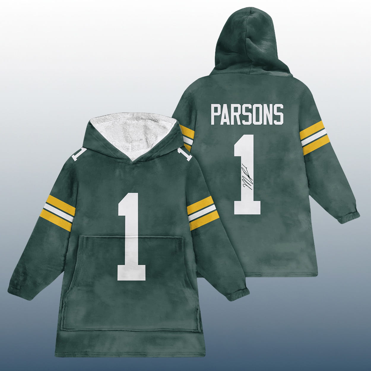 This hoodie is your ultimate sideline snuggle with a bold twist. Styled like a football jersey, this hoodie features a vibrant green base with yellow and white sleeve stripes that scream team spirit. The number “1” dominates both front and back, while “PARSONS” stretches proudly across the shoulders. A signature-style marking on the back number adds a personal touch, making this hoodie feel like a signed tribute to your favorite playmaker. It’s a wearable celebration of fandom, flair, and fearless comfort.