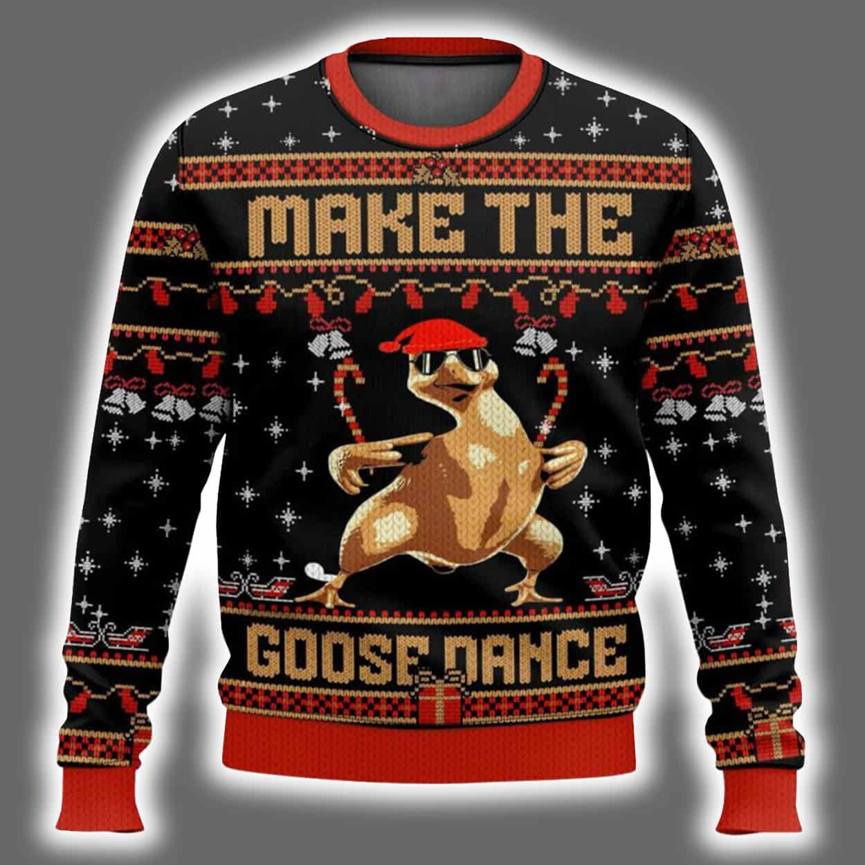 Get ready to honk your way through the holidays with the Make The Goose Dance Ugly Christmas Sweater. A quirky blend of festive charm and feathered fun, perfect for party-goers who love a good laugh and a great outfit.