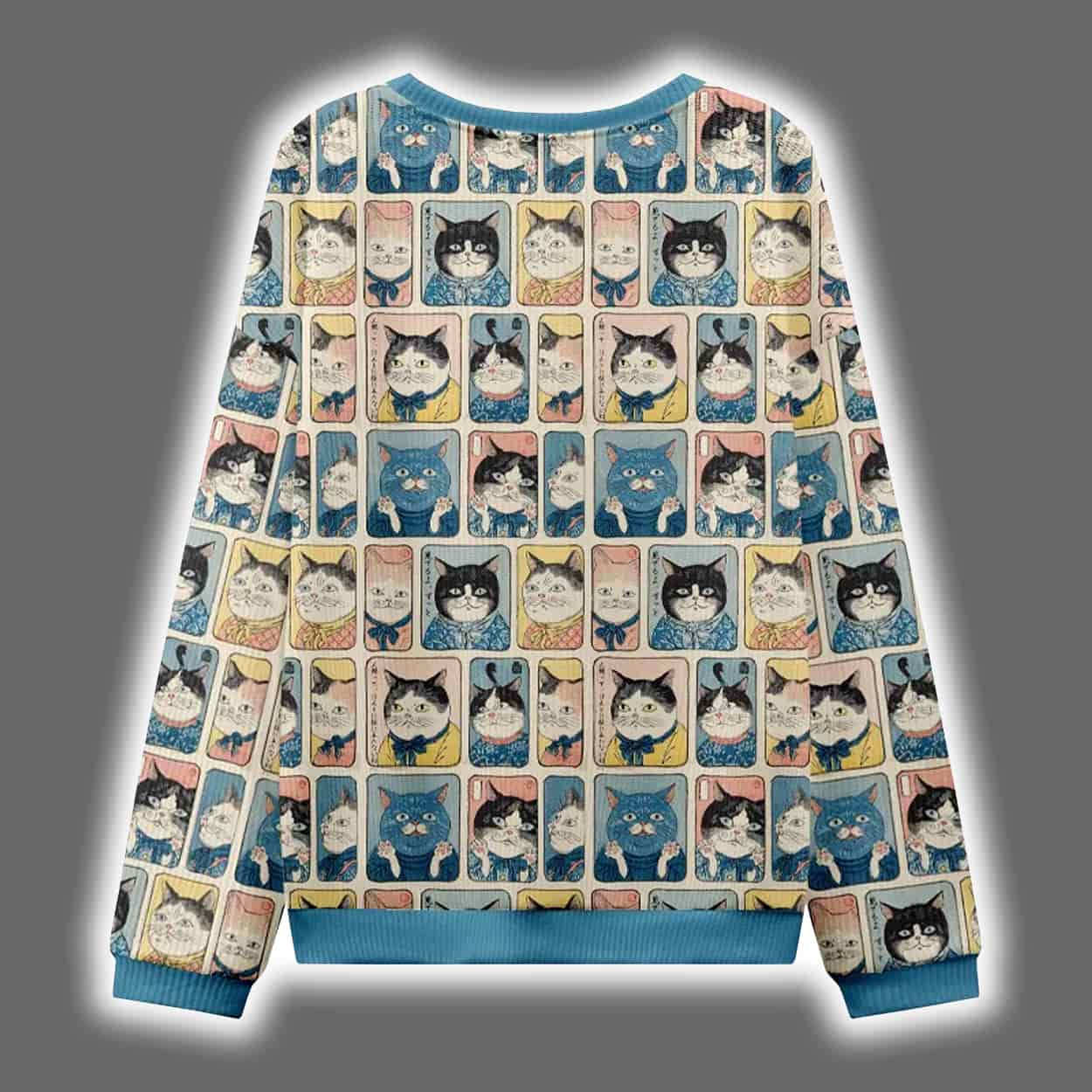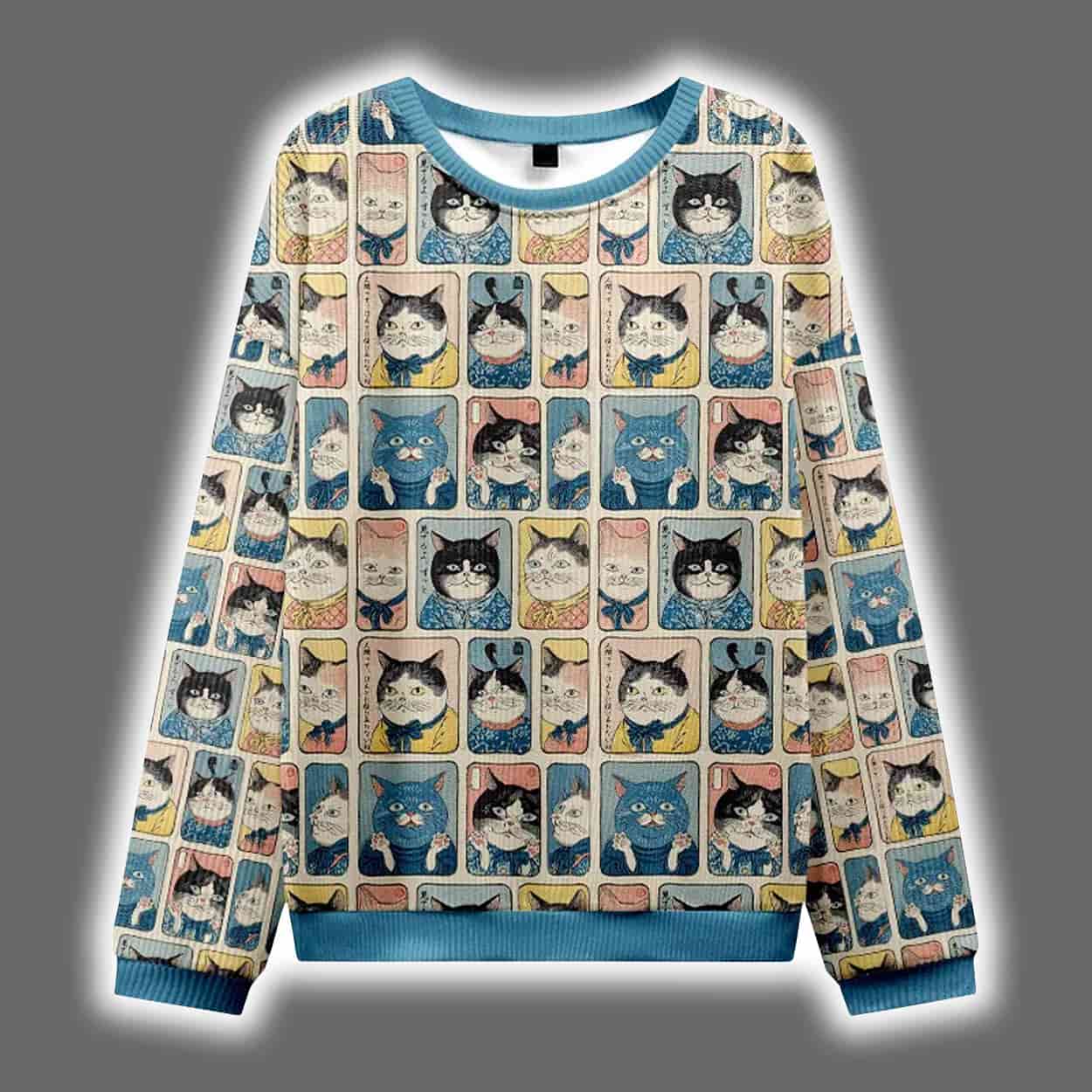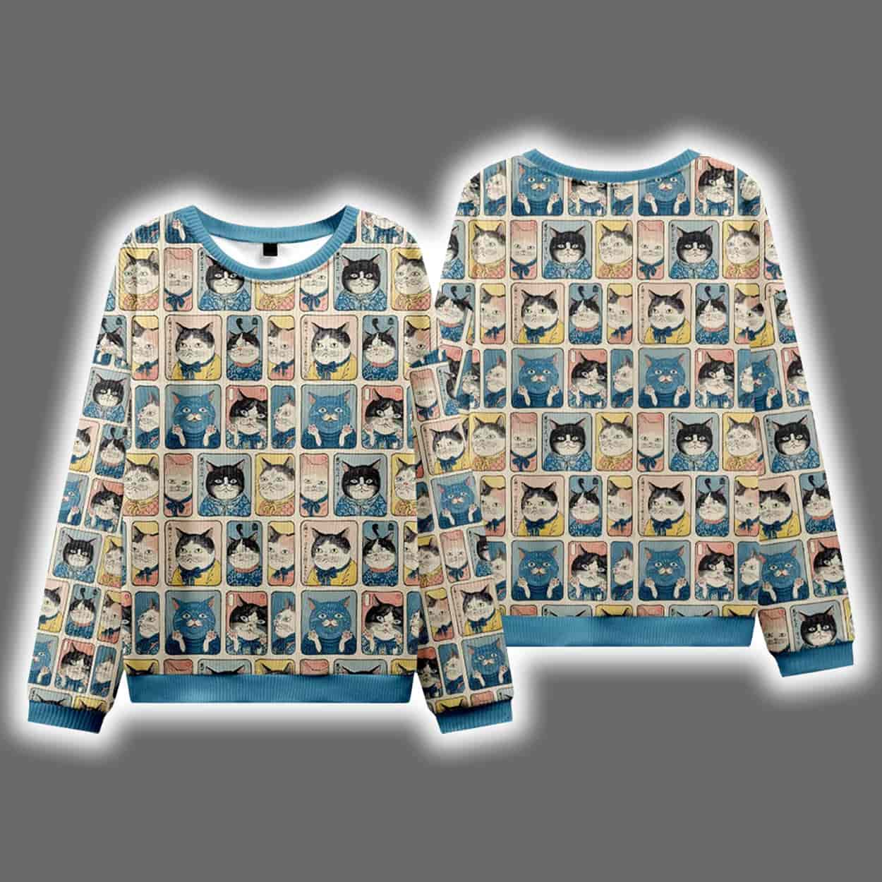 Step into the spotlight—or the laser pointer beam—with this sweater. This eye-catching design features a grid of comic-style panels, each bursting with colorful cat characters in various moods and mischief. From curious stares to judgmental glares, these feline faces are everywhere, giving the impression that you’re being watched… by dozens of tiny, festive cat overlords. The sweater’s vibrant layout is framed by bold blue cuffs and neckline, adding contrast to the chaotic charm of the multicolored comic strip design. It’s not just a sweater—it’s a wearable cat-tastrophe in the best way.