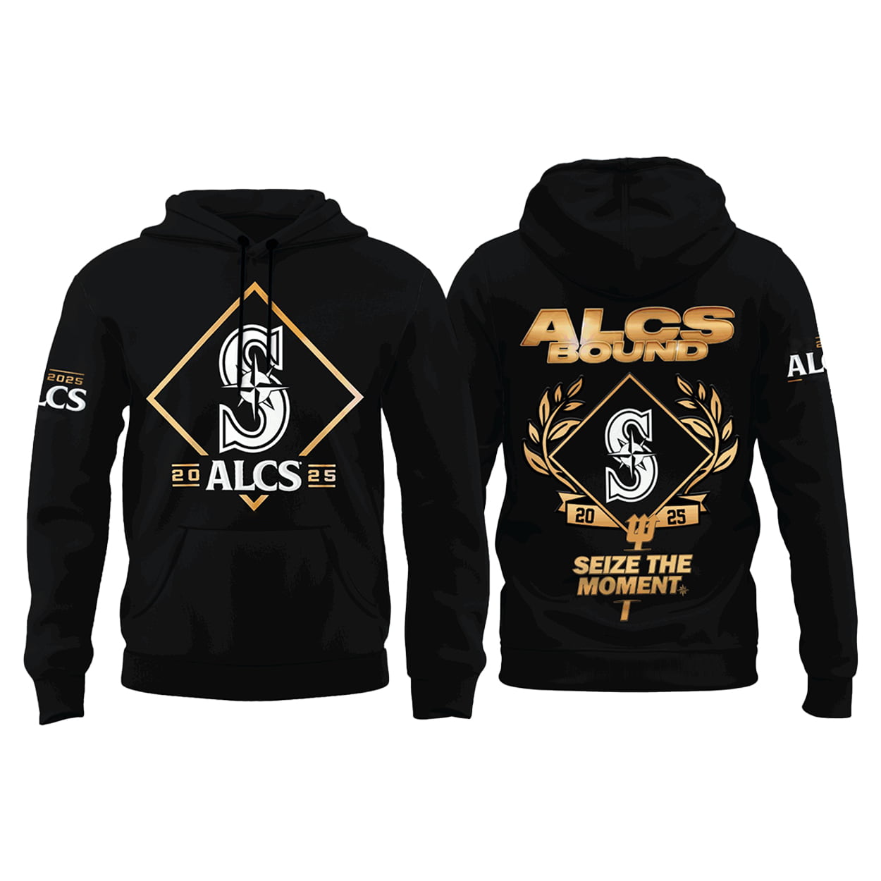 This hoodie is more than just a piece of fan gear—it’s a wearable trophy. This hoodie features a bold diamond-shaped emblem on the front with a stylized “S” at its heart, flanked by the year “2025” and the proud “ALCS” title below. Turn around, and the back roars with “ALCS BOUND” in commanding block letters, crowned by a laurel wreath encircling “2025” and a trident symbol that channels the team’s fierce maritime spirit. The phrase “SEIZE THE MOMENT.” anchors the design, reminding fans of the grit it took to get here.