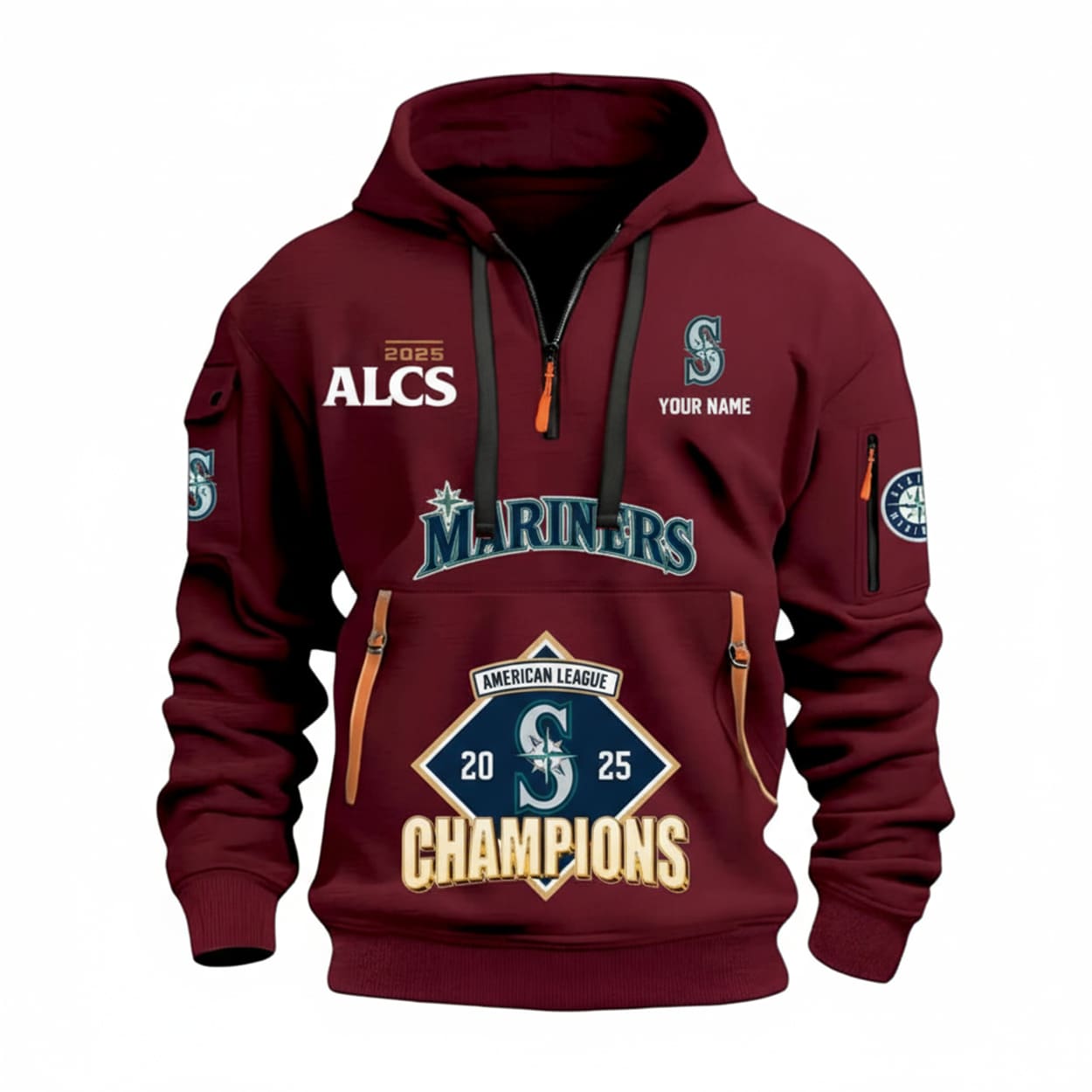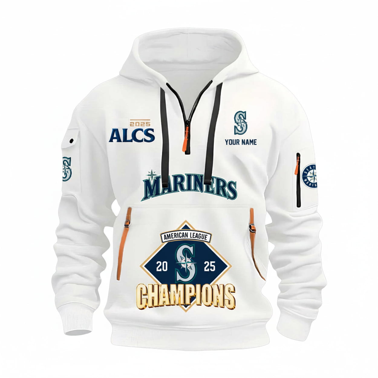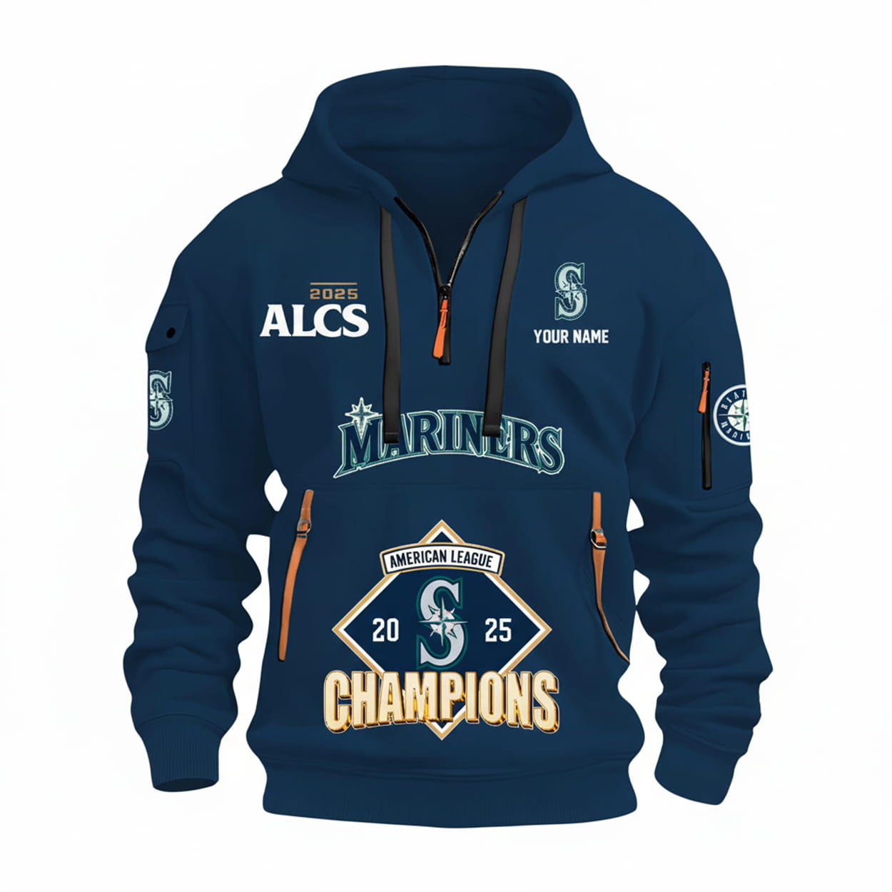 Step into the winner’s circle with the ultimate fan gear. Drenched in navy blue and accented with fiery orange zippers, this hoodie doesn’t whisper victory—it shouts it. Front and center, “MARINERS” blazes beneath the team’s iconic logo, while a diamond-shaped emblem proudly declares “2025 AMERICAN LEAGUE CHAMPIONS.” The left chest boasts “2025 ALCS” in crisp white, and the right side is ready for your name to be printed alongside the Mariners compass. With logo on the sleeve and a zippered pocket for your essentials, this hoodie is as functional as it is fierce.