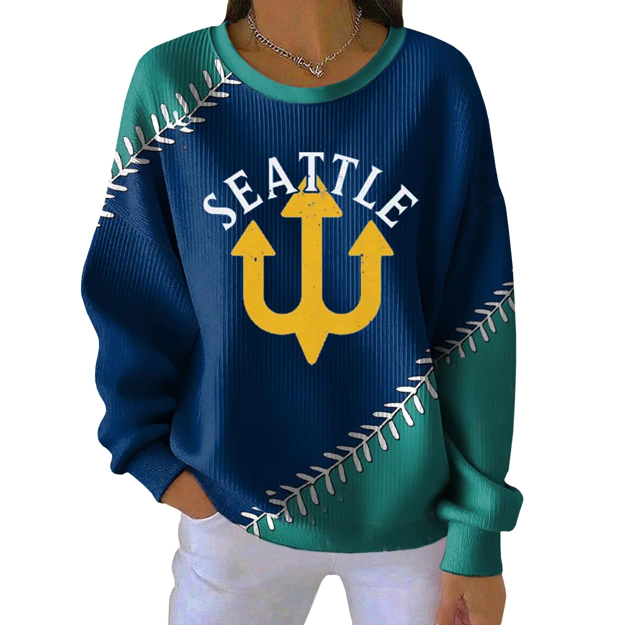 Ready to make a splash? Throw on the Mariners Baseball Trident Print Ribbed Pit Striped Crew Neck Sweatshirt and let your style speak volumes. It’s not just a sweatshirt—it’s your personal wave of confidence.