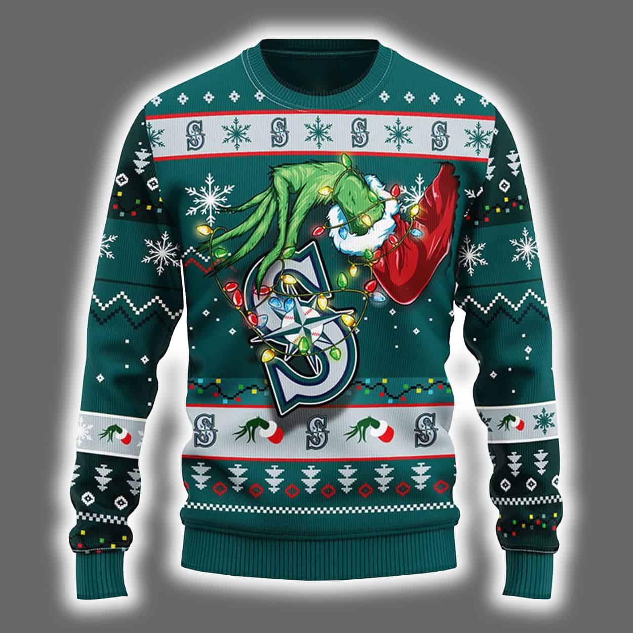 Celebrate the holidays with a mischievous twist in the Mariners Grnch Hand Ugly Christmas Sweater—where festive cheer meets Seattle baseball pride in one unforgettable look.