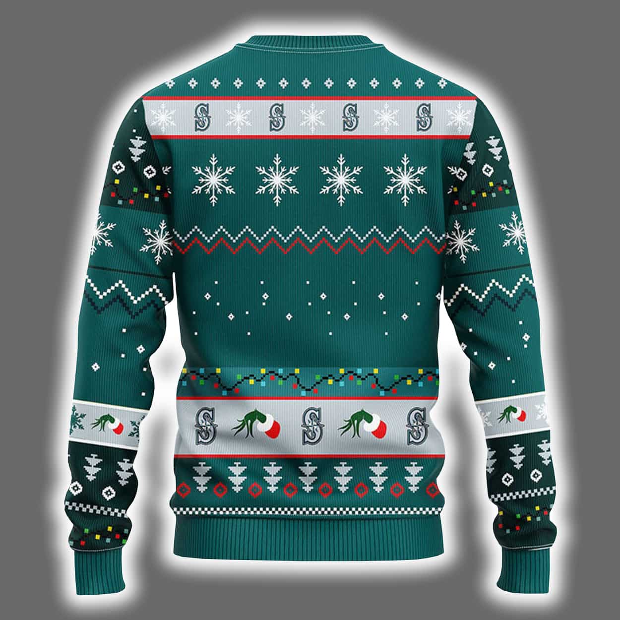 This sweater is a full-blown holiday spectacle for Seattle Mariners fans who like their cheer with a side of sass. Set against a deep teal backdrop, the front features the iconic Grinch reaching down with his sly green fingers to snatch a ornament emblazoned with the Mariners’ stylized “S” logo and compass rose. Snowflakes swirl around him, while candy canes, Christmas trees, and rows of mini “S” logos add layers of festive flair. The back keeps the celebration going with symmetrical bands of snowflakes, ornaments, and holiday motifs that echo the front’s bold energy. It’s playful, punchy, and perfect for fans who want to stand out.