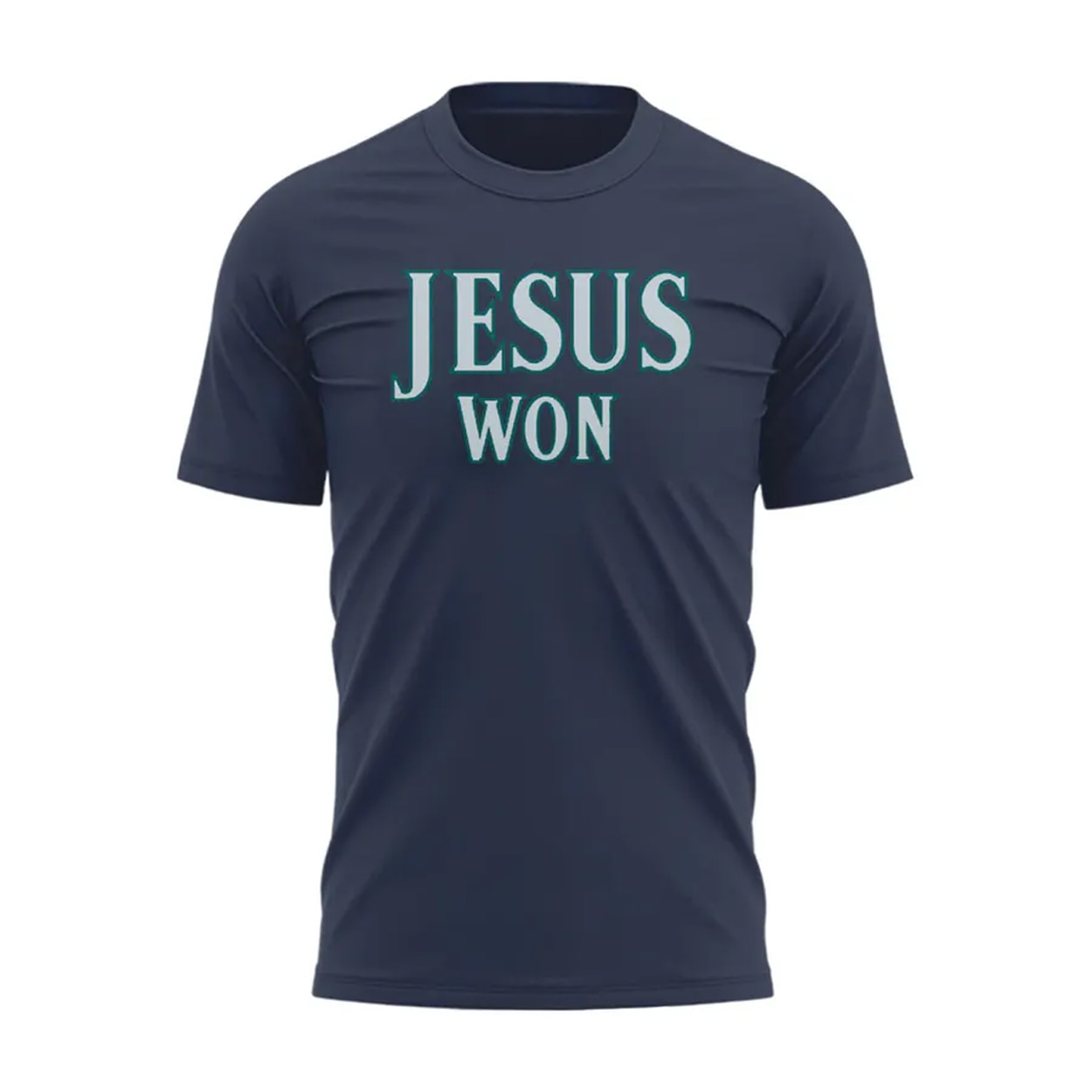 Step up to the plate with this shirt, a striking navy blue tee that’s as bold in message as it is in design. On the front, the phrase “JESUS WON” is emblazoned in crisp, light blue block letters—clear, confident, and impossible to miss. Flip it around and you’ll find a clever twist on the iconic Seattle Mariners logo: anchored by a compass star, subtly nodding to divine direction. Whether you’re at the ballpark or the pulpit, this shirt makes a statement that’s both stylish and spiritual.