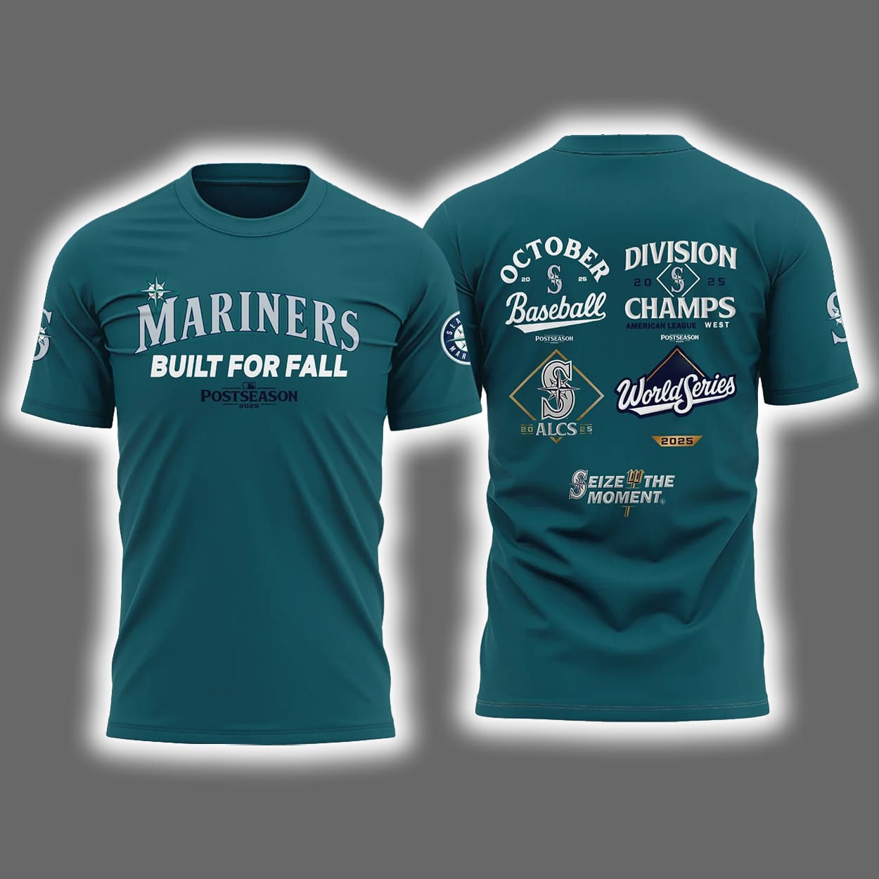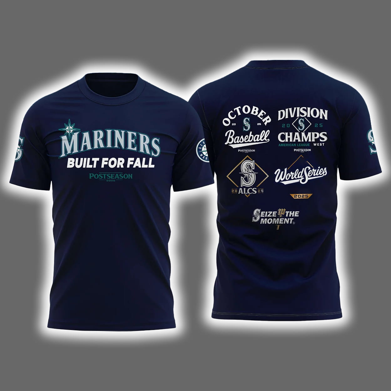 This isn’t just a shirt—it’s a rally cry printed into navy blue. The front proudly declares “MARINERS BUILT FOR FALL” in bold, battle-ready lettering, with “POSTSEASON” tucked beneath like a secret handshake among die-hard fans. Flip it around and the back explodes with postseason pride: “OCTOBER BASEBALL” and “DIVISION CHAMPS” set the tone, while iconic emblems like “ALDS,” “World Series,” and the electrifying “SEIZE THE MOMENT” tagline remind everyone that the Mariners didn’t just show up—they made history.