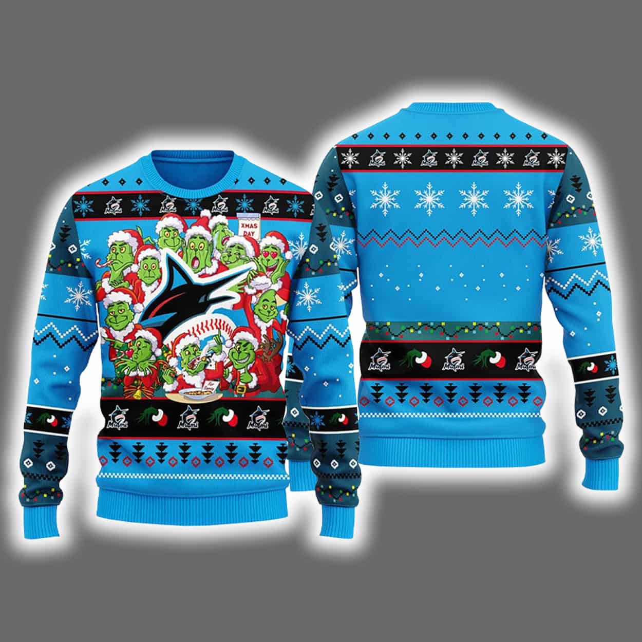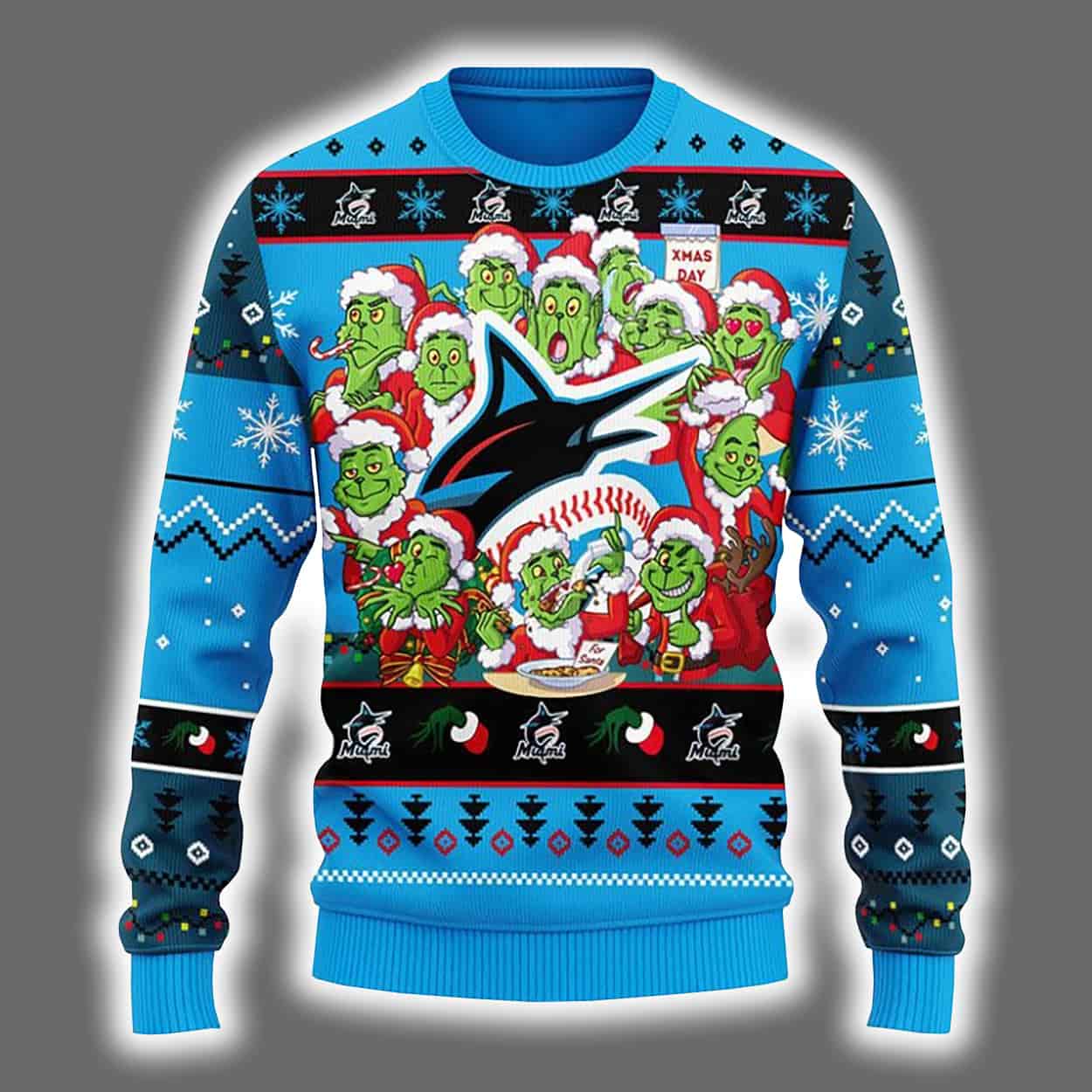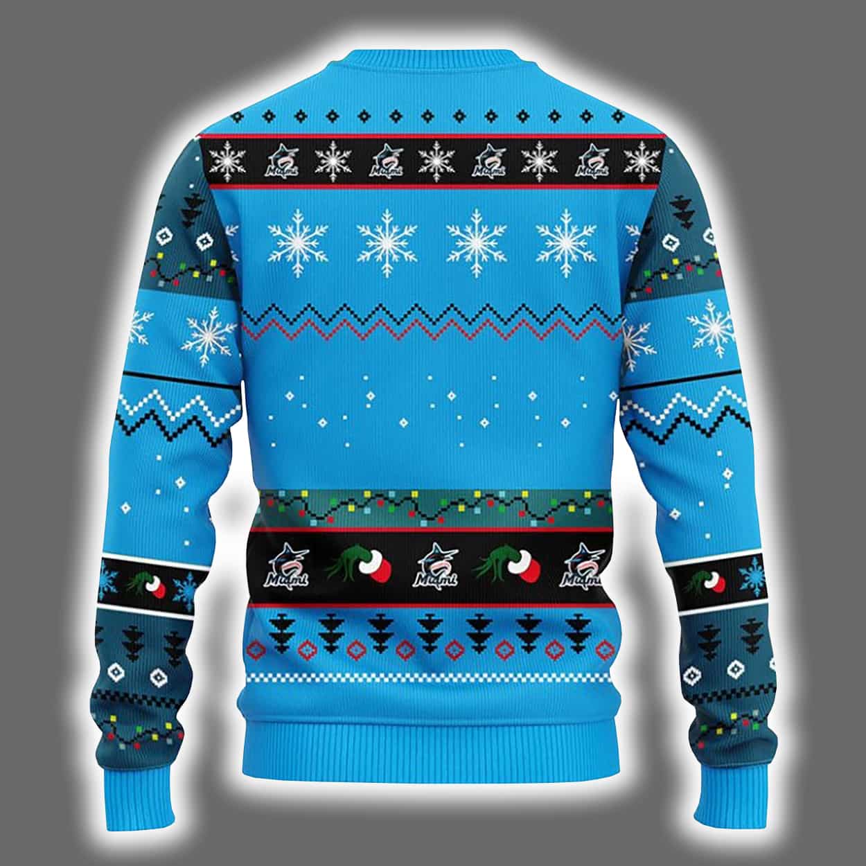 Dive into the holidays with this sweater, a vibrant celebration of baseball and seasonal cheer. The front features twelve green Grinch-like characters decked out in Santa suits, huddled around a stylized Miami Marlins logo set on a festive baseball field. The background bursts with snowflakes, candy canes, and holiday patterns in bold shades of blue, red, white, and black. The sleeves and lower hem continue the celebration with repeating Marlins logos and wintry motifs, while the back showcases symmetrical snowflake bands and a snowy landscape scene that wraps the design in holiday magic.