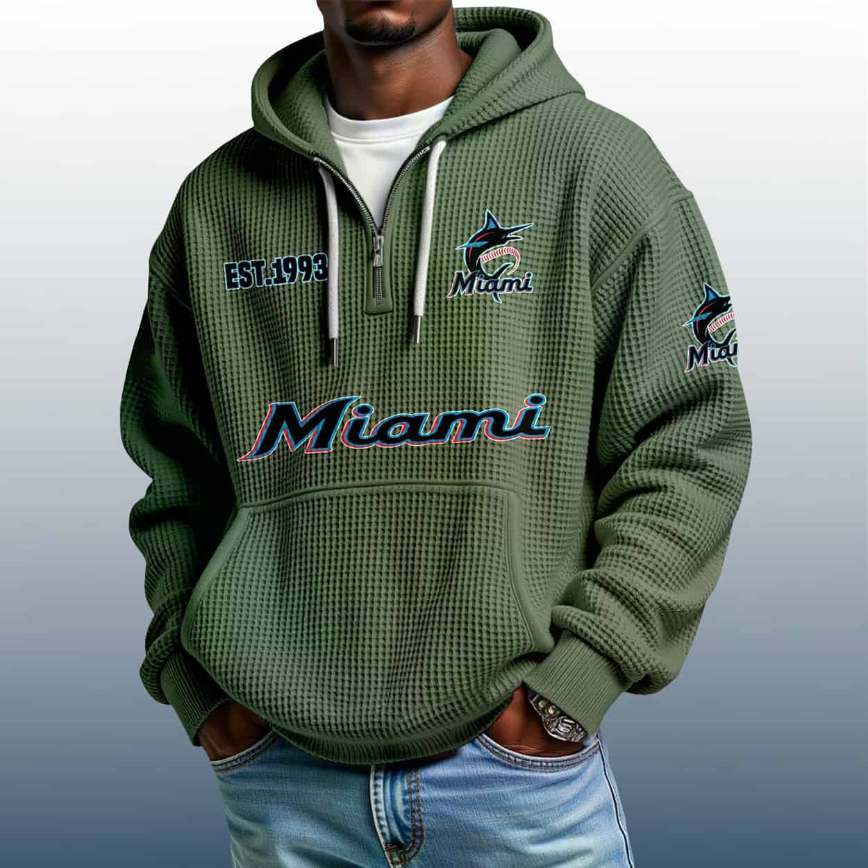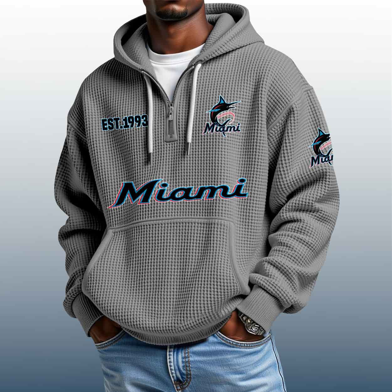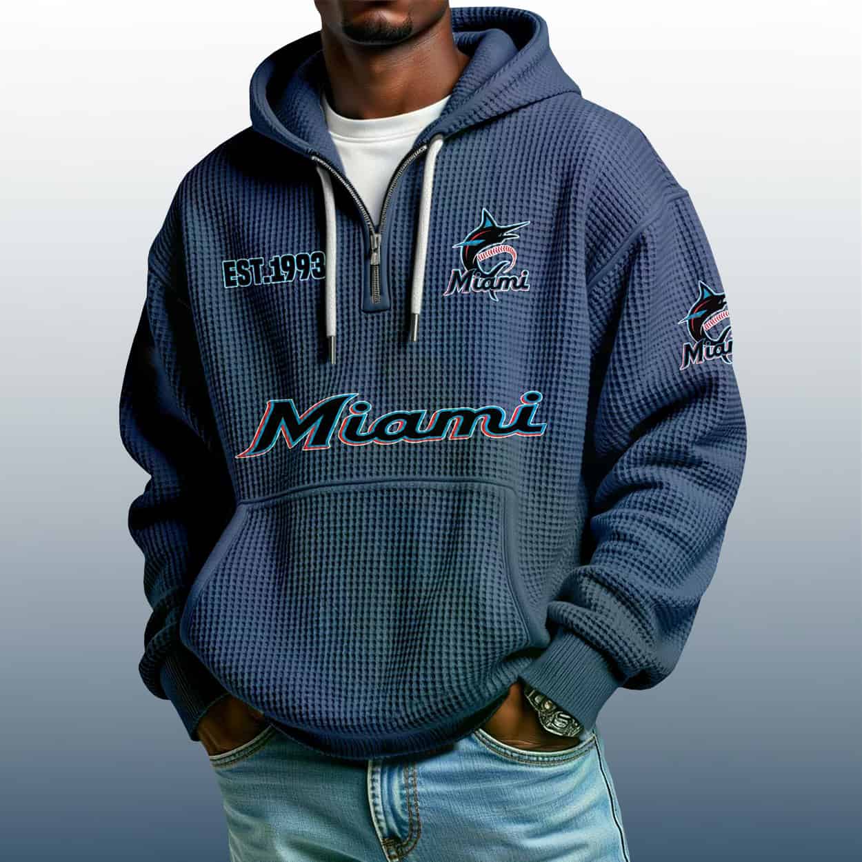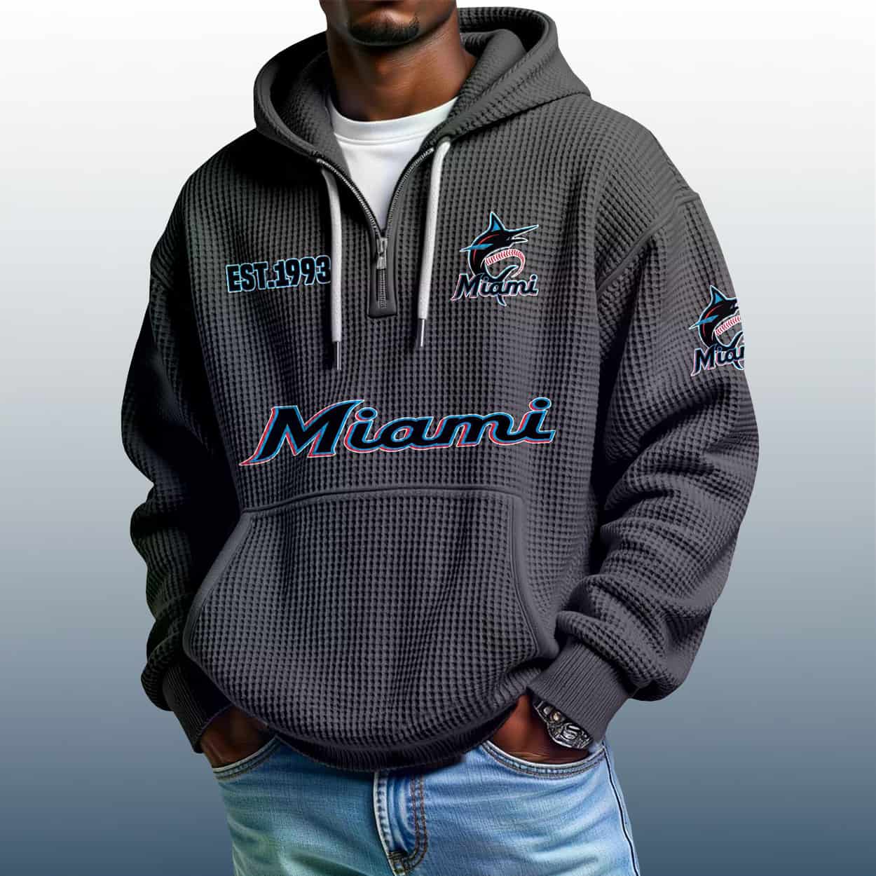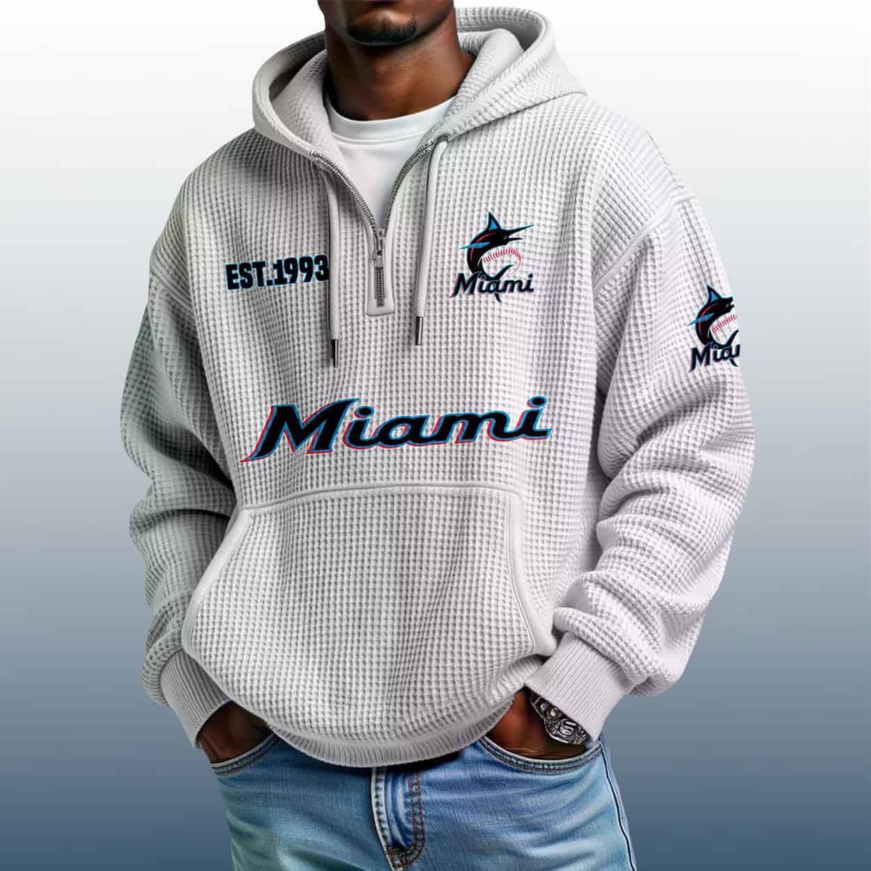 Make waves with the Marlins Est 1993 Quarter Zip Waffle Hoodie—where bold design meets Miami flair. A must-have for fans who love to stand out.